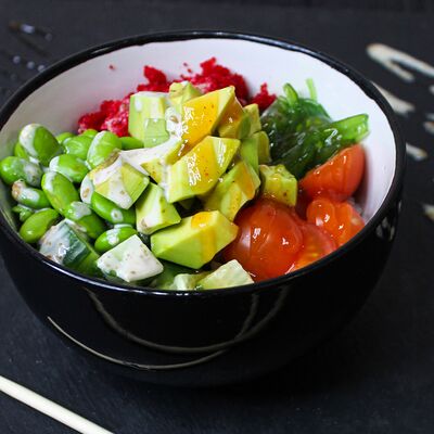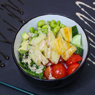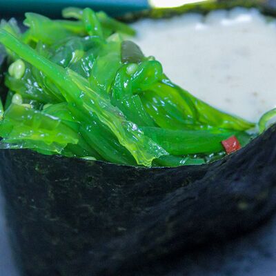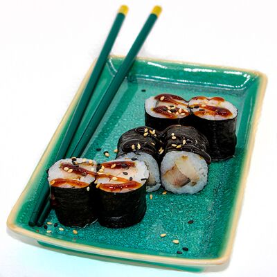 Рис для суши, угорь, сыр творожно-сливочный, салат чука, нори