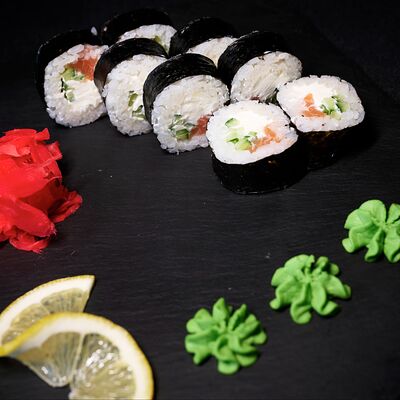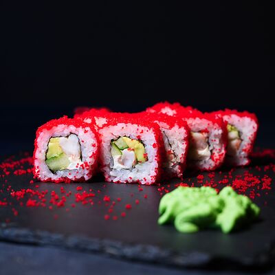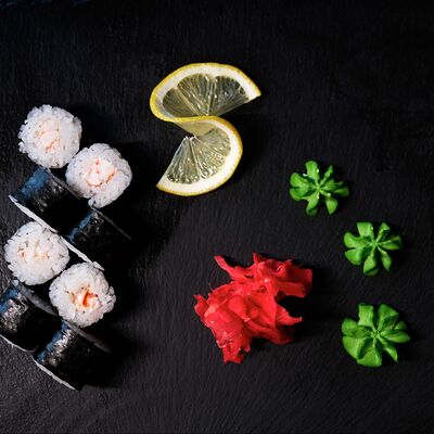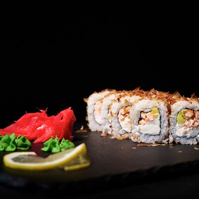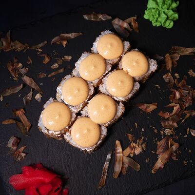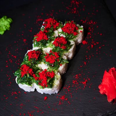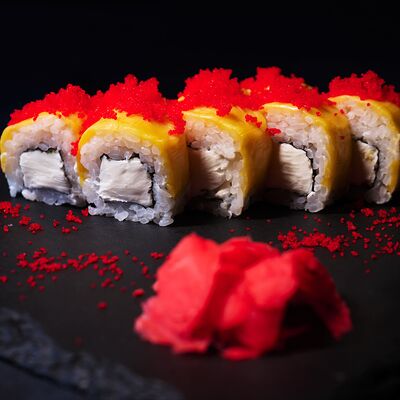 Тигровая креветка, сливочный сыр, икра масаго, чука, рис, нори