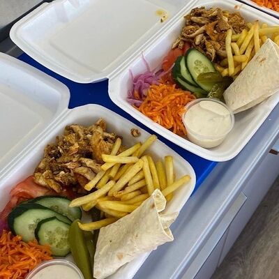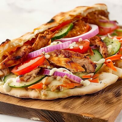 Сырный лаваш, куриное мясо, помидоры, огурец, лук, морковка, фирменный соус