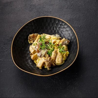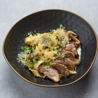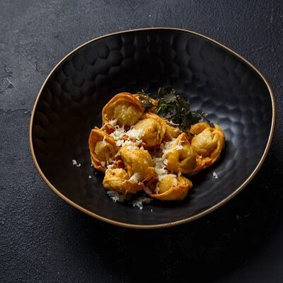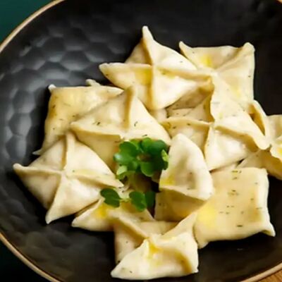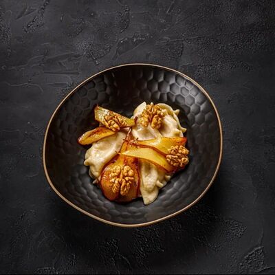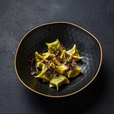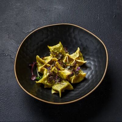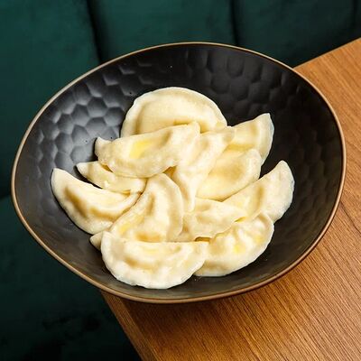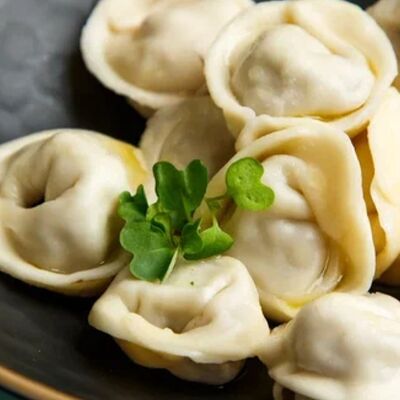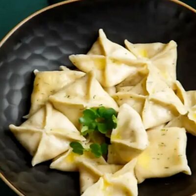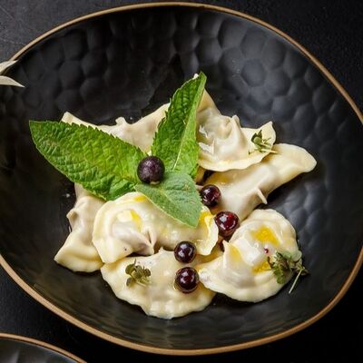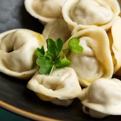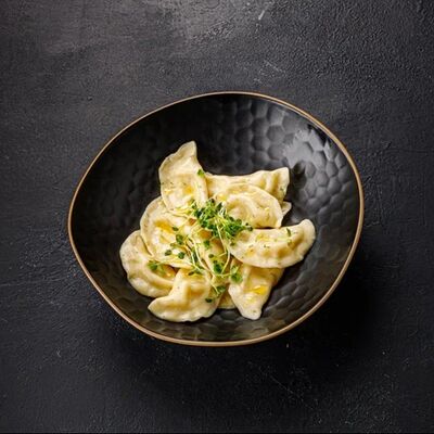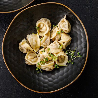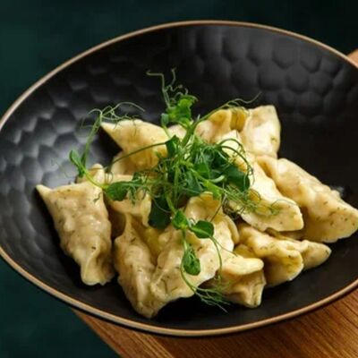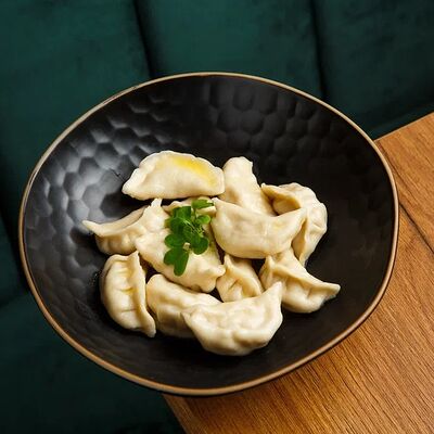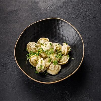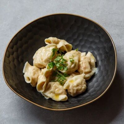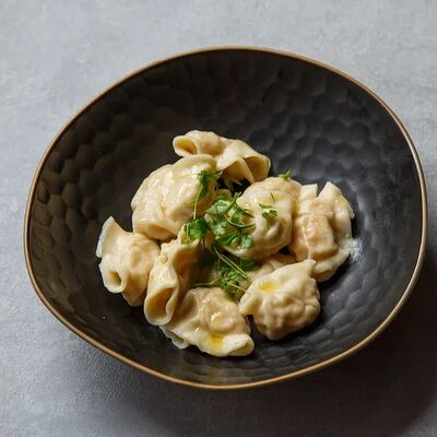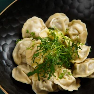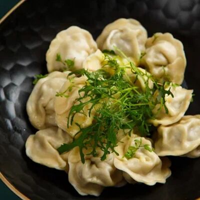 Пельмени (баранина мякоть, лук репчатый, сало курдючное, перец черный, зира молотая, кориандр молотый, кинза свежая, молоко, мука пшеничная в/с, яйцо куриное, вода, соль), топленое сливочное масло, микрозелень (12 шт)