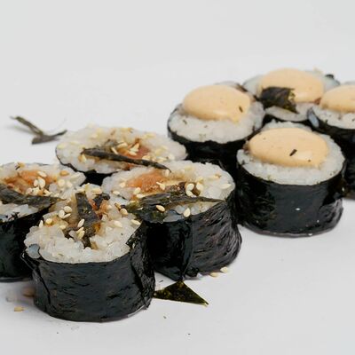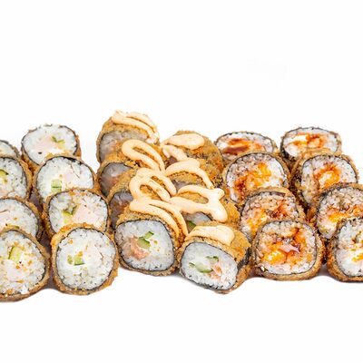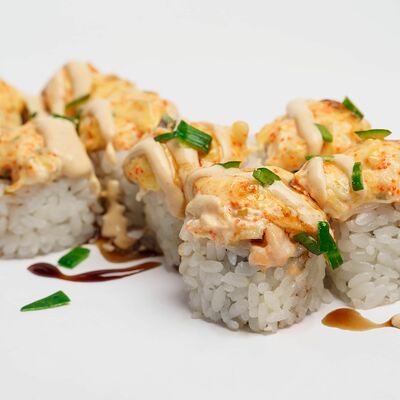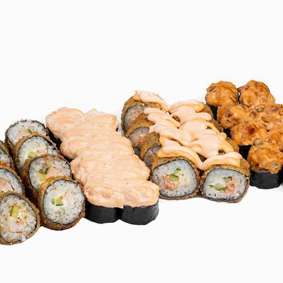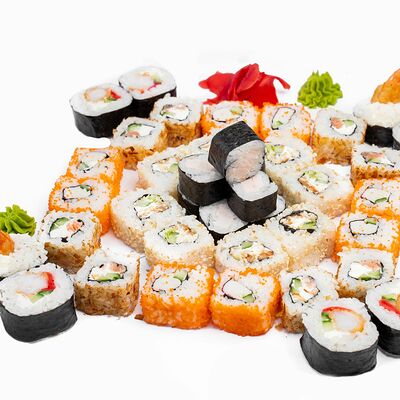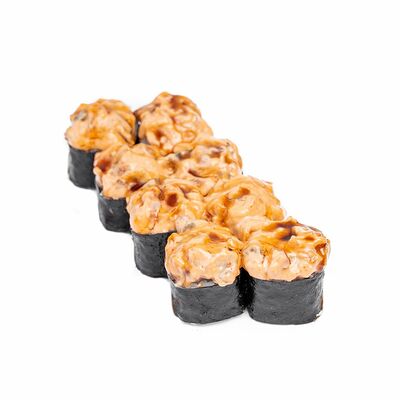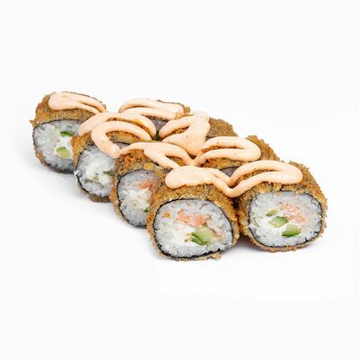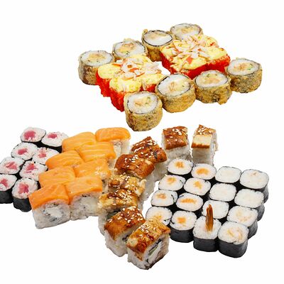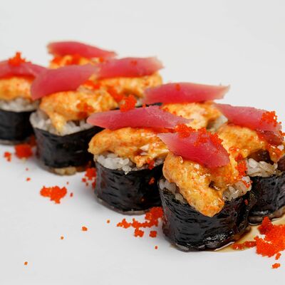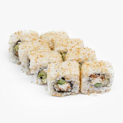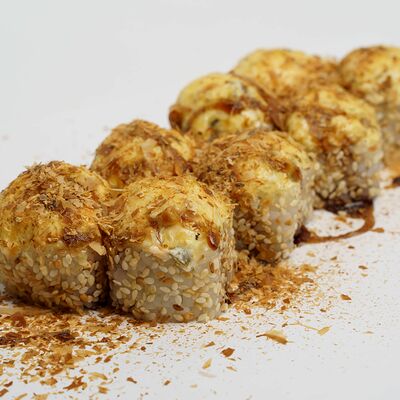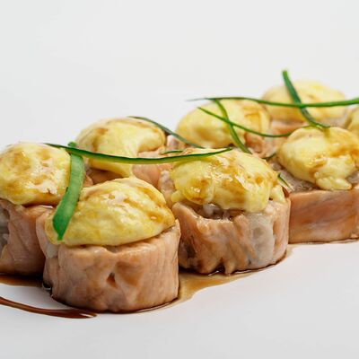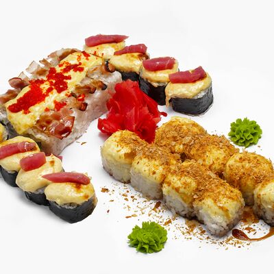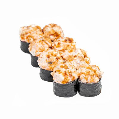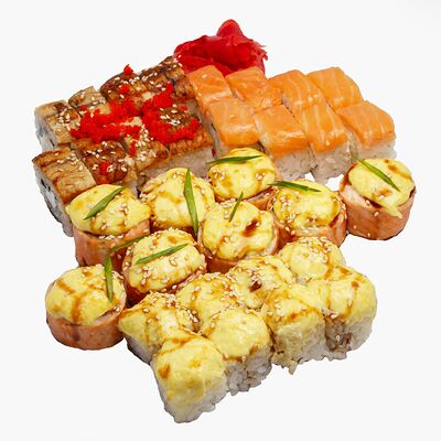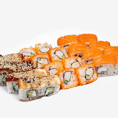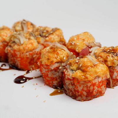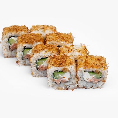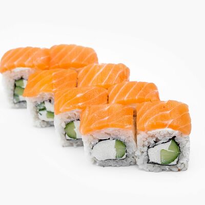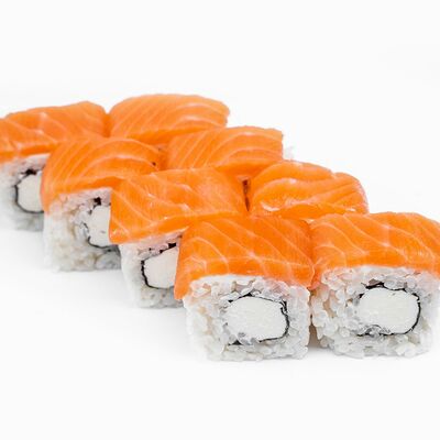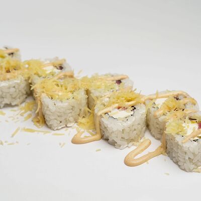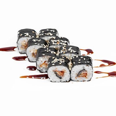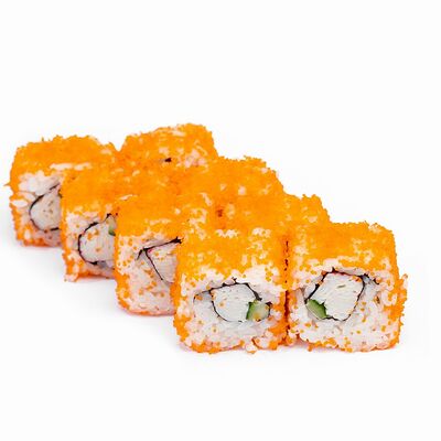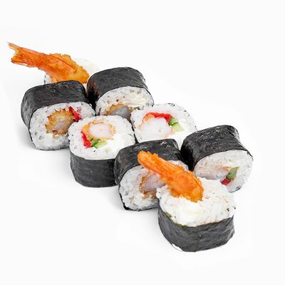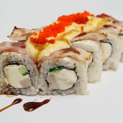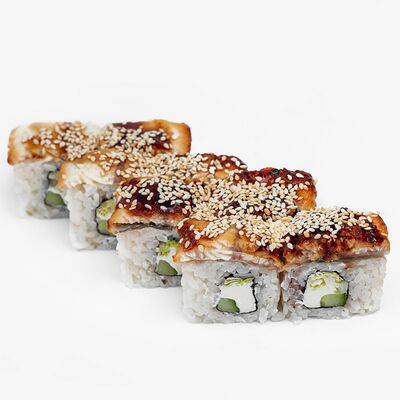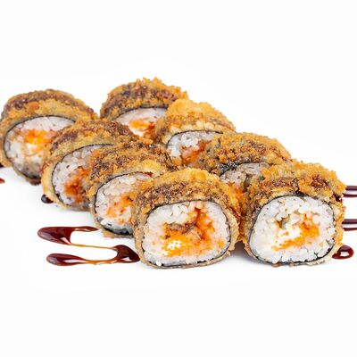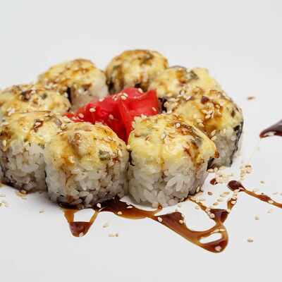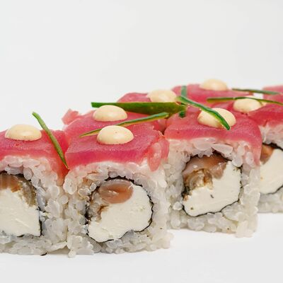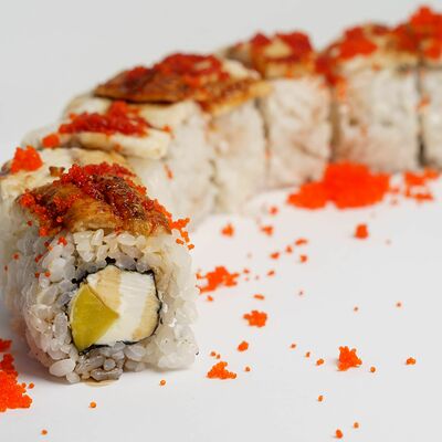 Рис, нори, сливочный сыр, угорь, дайкон, масаго
