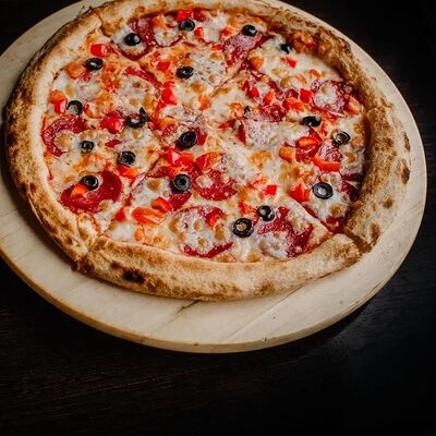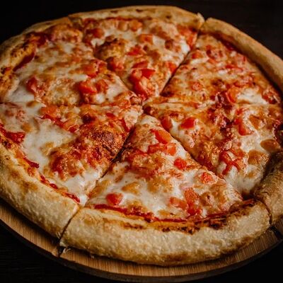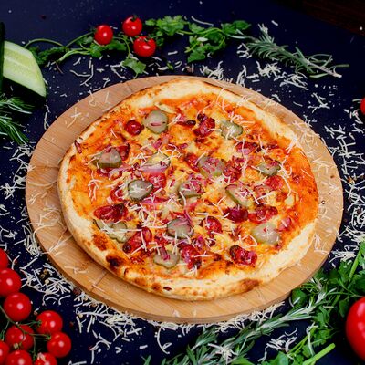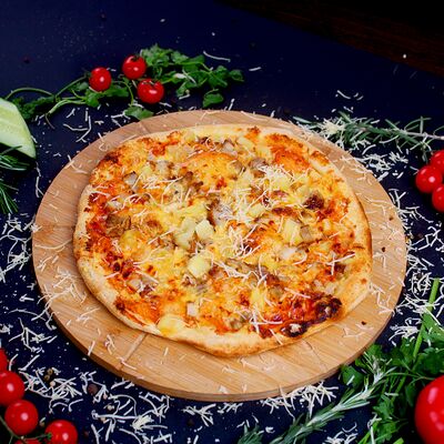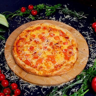 Моцарелла, томатный соус для пиццы, фарш говяжий, курица, томаты, грибы (25 см)