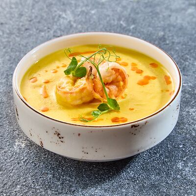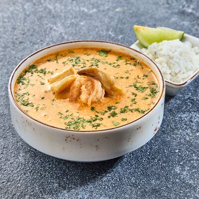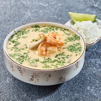 Не острая версия супа том ям. Кокосовое молоко, черри, кальмар, креветки, грибной бульон, вешенки, зелень, рис
