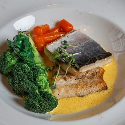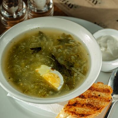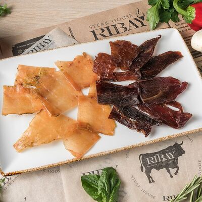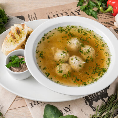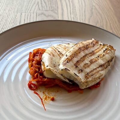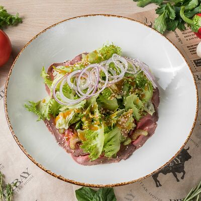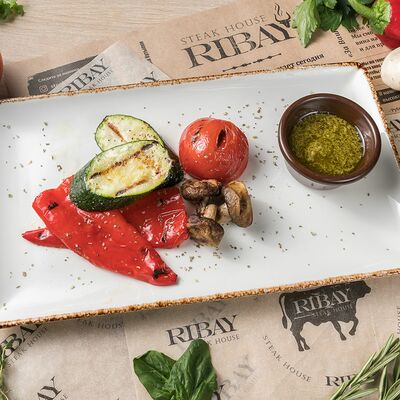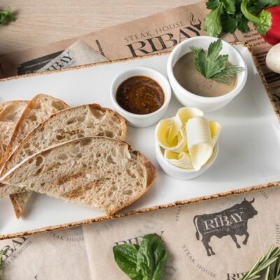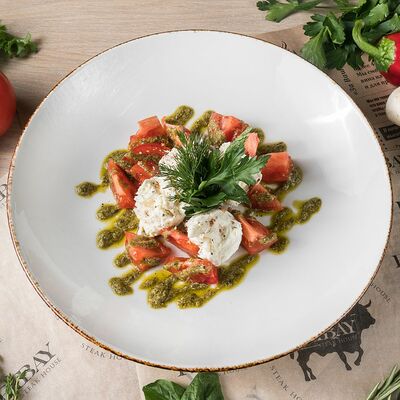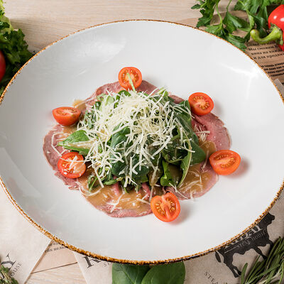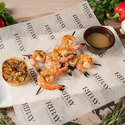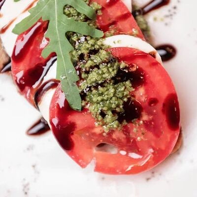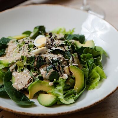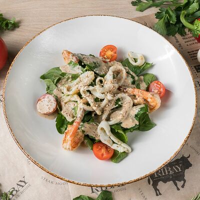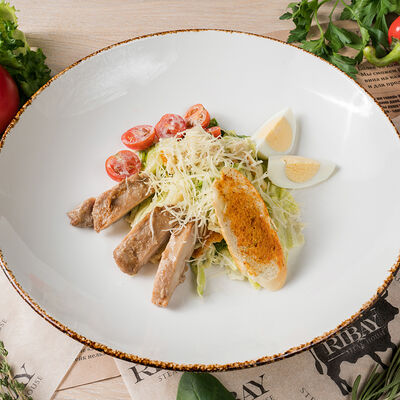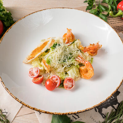 Креветки, листья салата романо, томаты, соус с анчоусами, сыр, гренки
