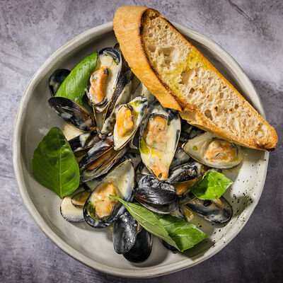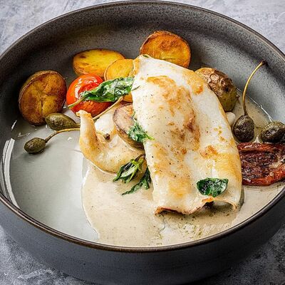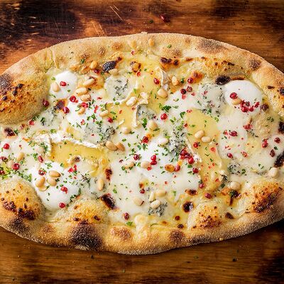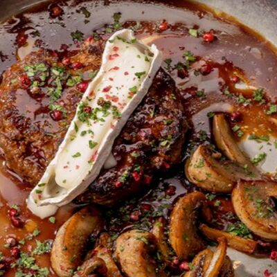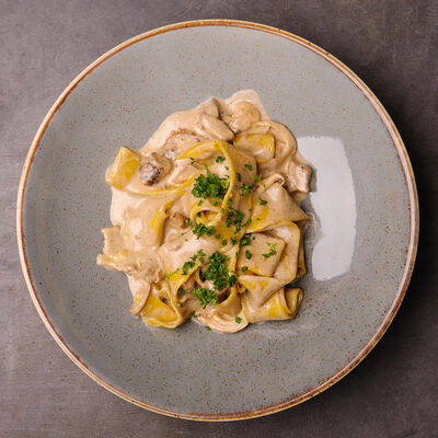Белые грибы, шампиньоны, грецкий орех, сыр Моцарелла, трюфельное масло, сливочно-трюфельный соус
