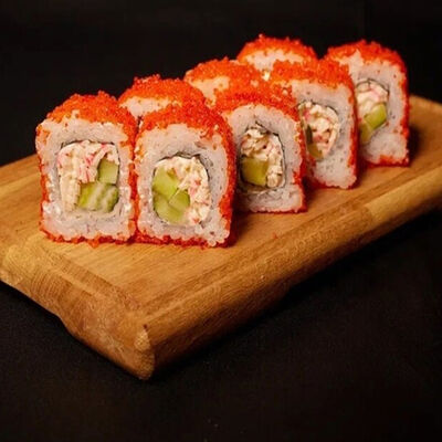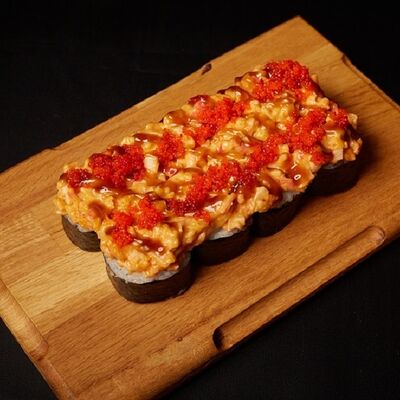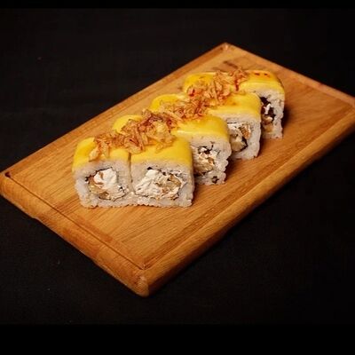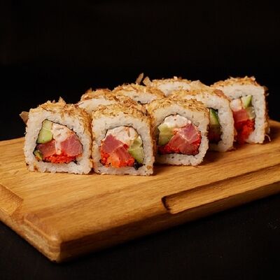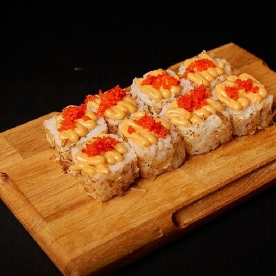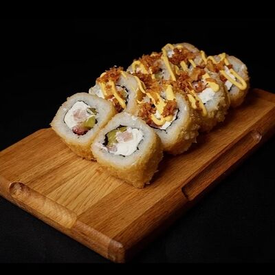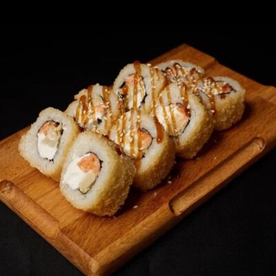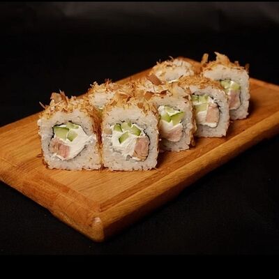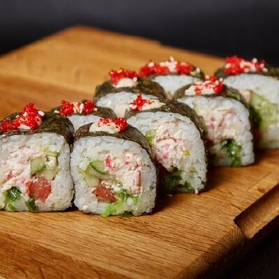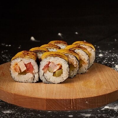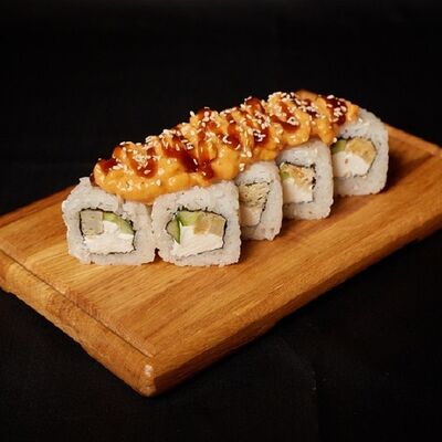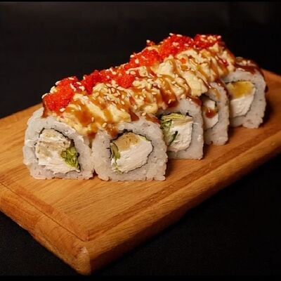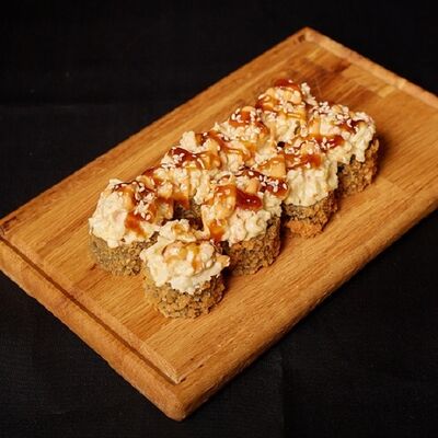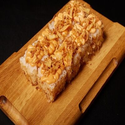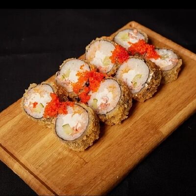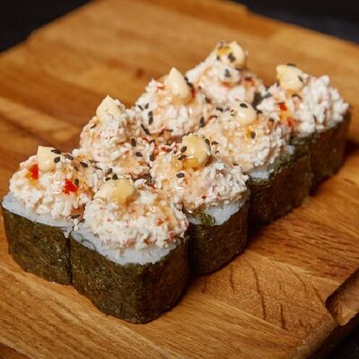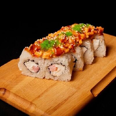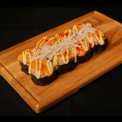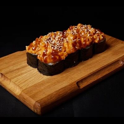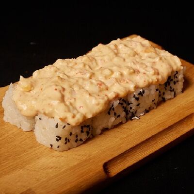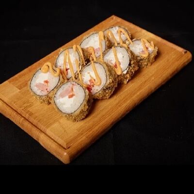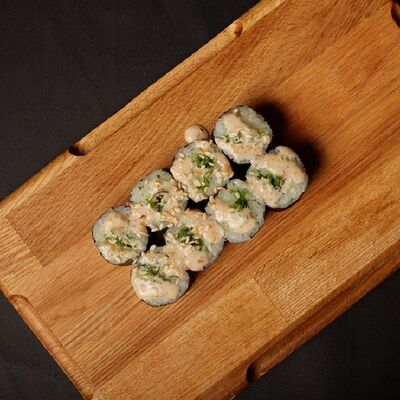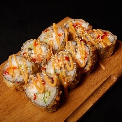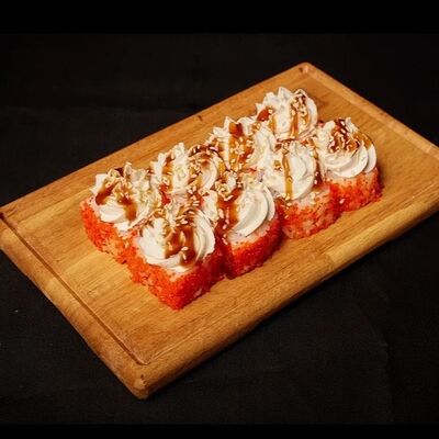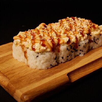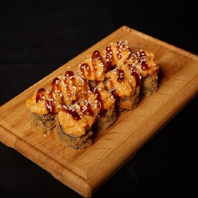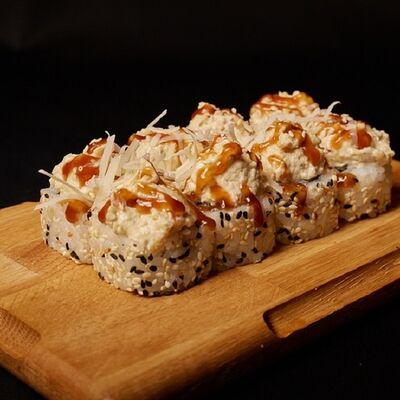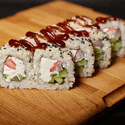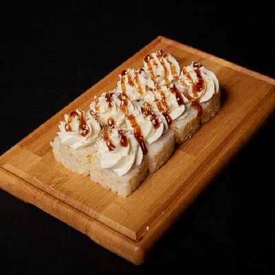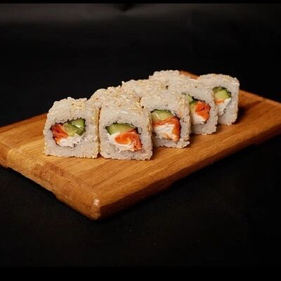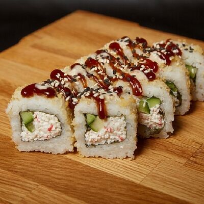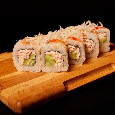 Необходимые позиции: имбирь, васаби, соевый соус и палочки заказываются отдельно. Сочный ролл в кунжуте с двойной порцией сливочного краба (имитация) и хрустящим огурчиком. Украшается соусом чили и твердый сыр (пармезан)