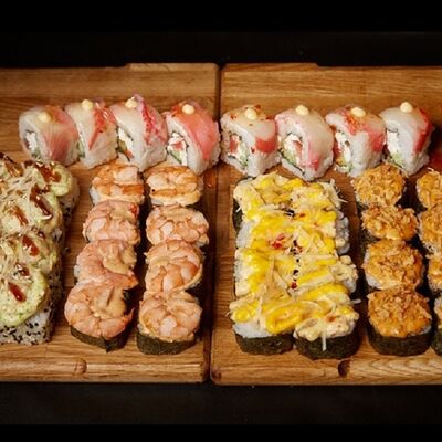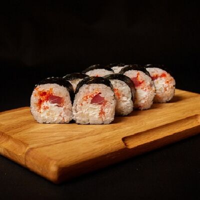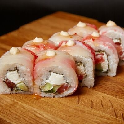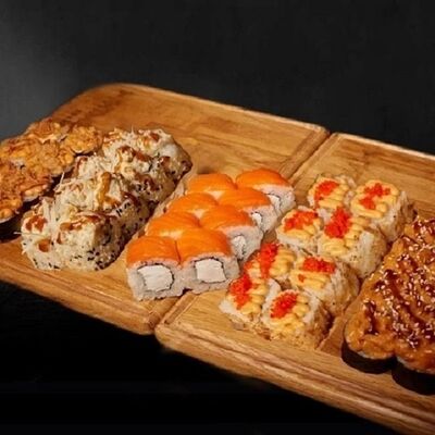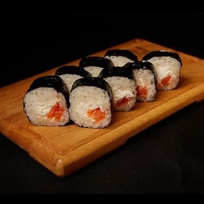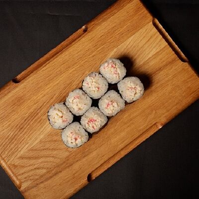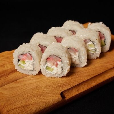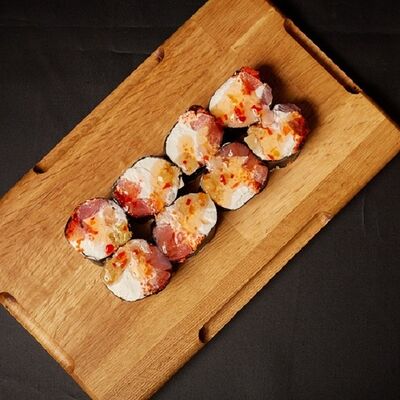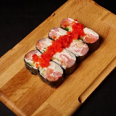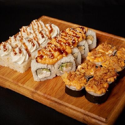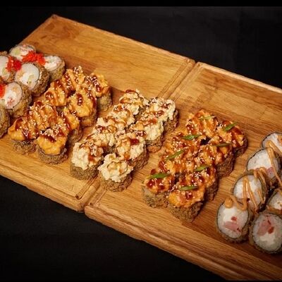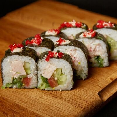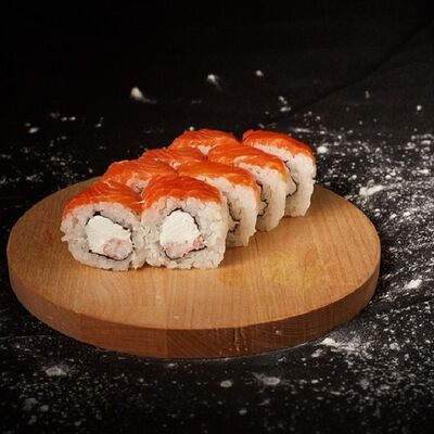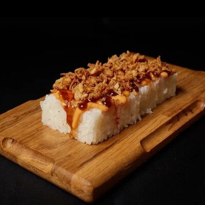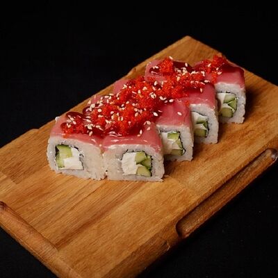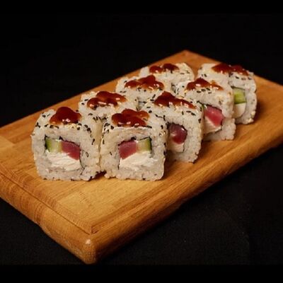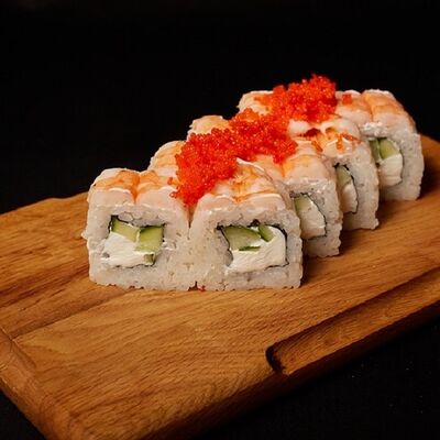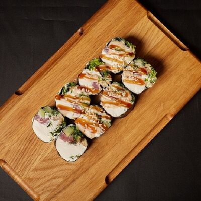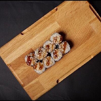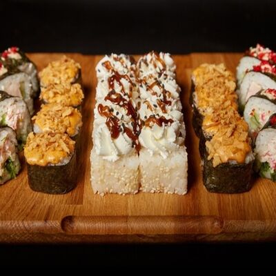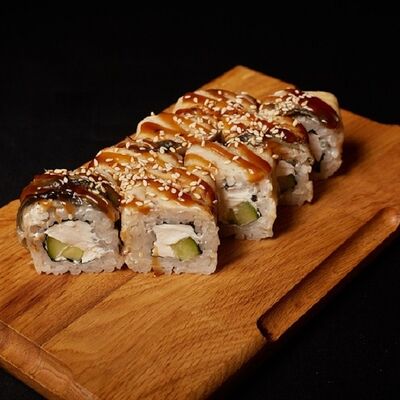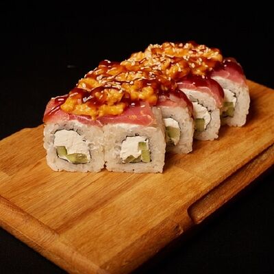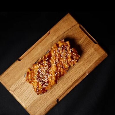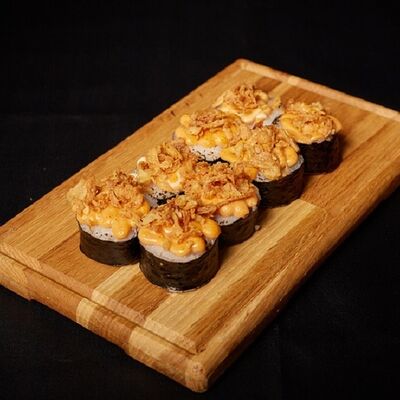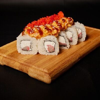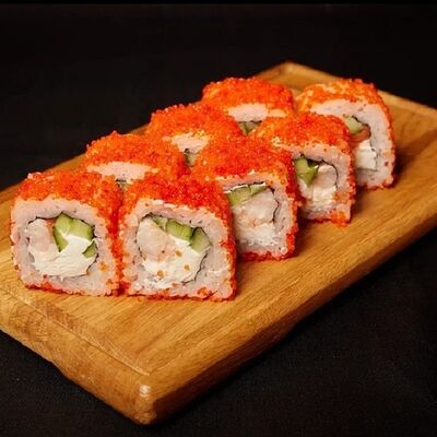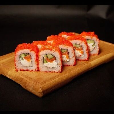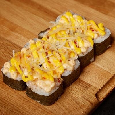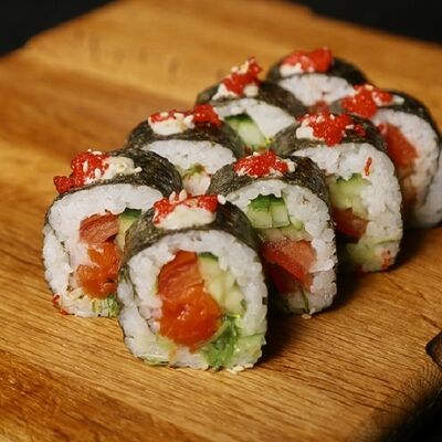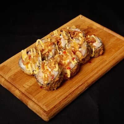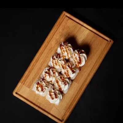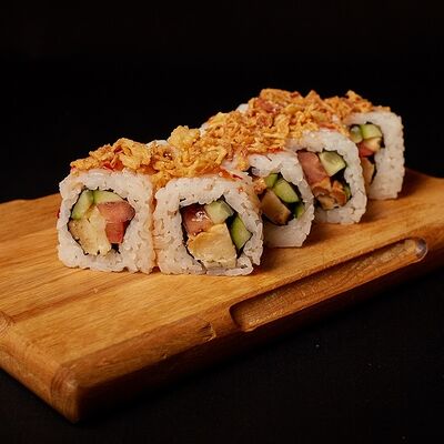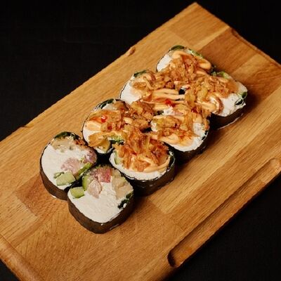 Необходимые позиции: имбирь, васаби, соевый соус и палочки заказываются отдельно. Сочный ролл в кунжуте с двойной порцией сливочного краба (имитация) и хрустящим огурчиком. Украшается соусом чили и твердый сыр (пармезан)