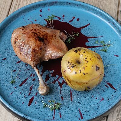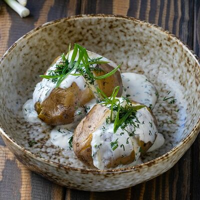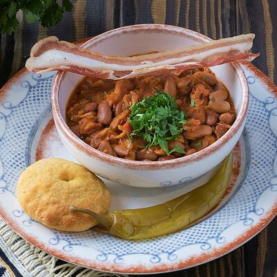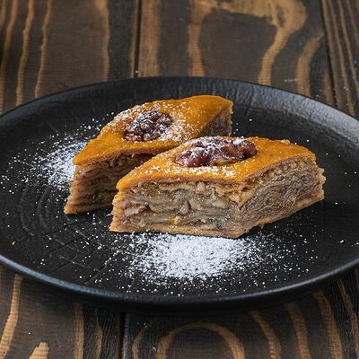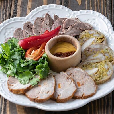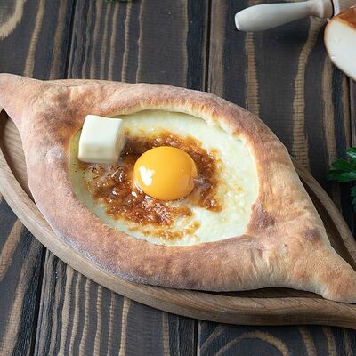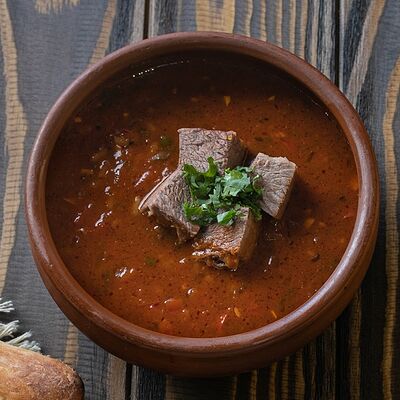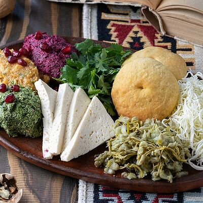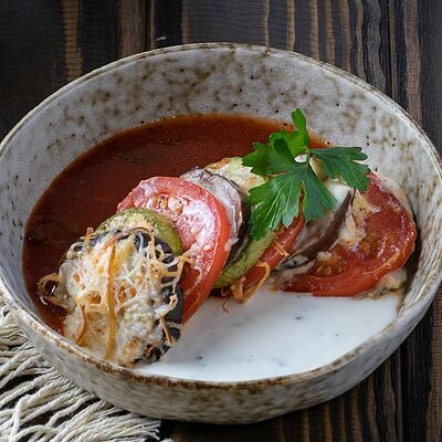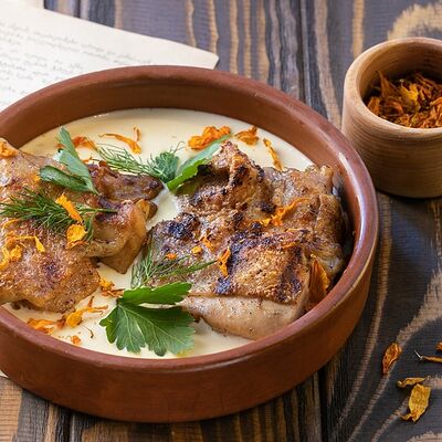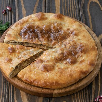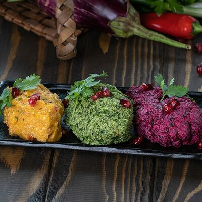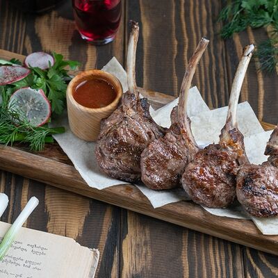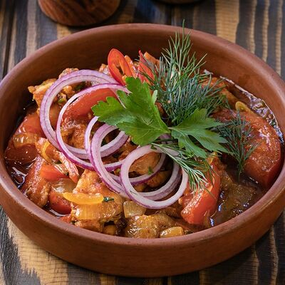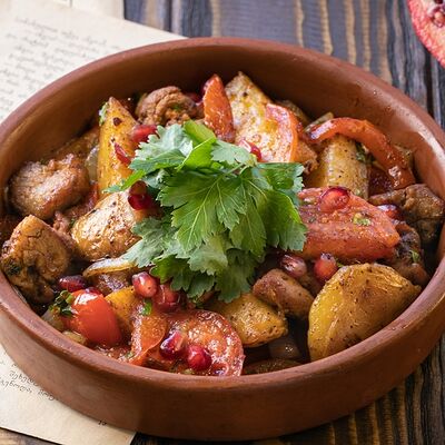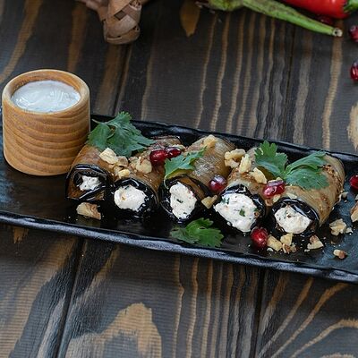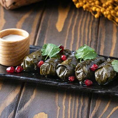 Рубленая свинина и говядина, винoградные листья, острый перец, лук, чеснок, рис, уцхо-сунели. Подается с соусом мацони и украшается кинзой и зернами граната