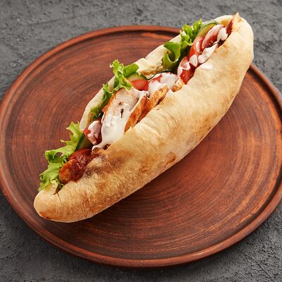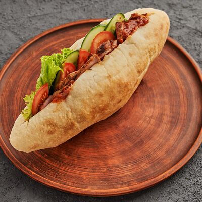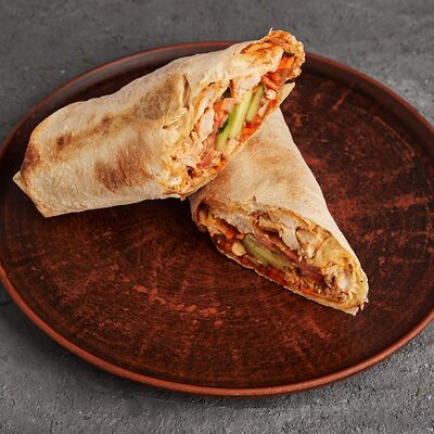 Курица, капуста, морковь, огурец, помидор, соленый огурец, лук красный, соус от шеф-повара, лепёшка (карс)