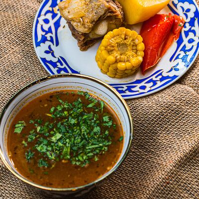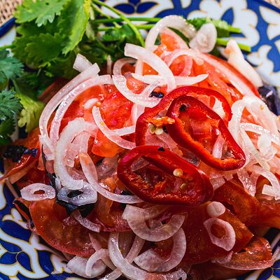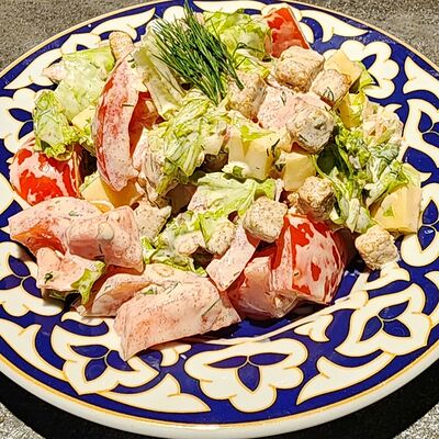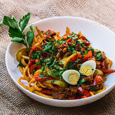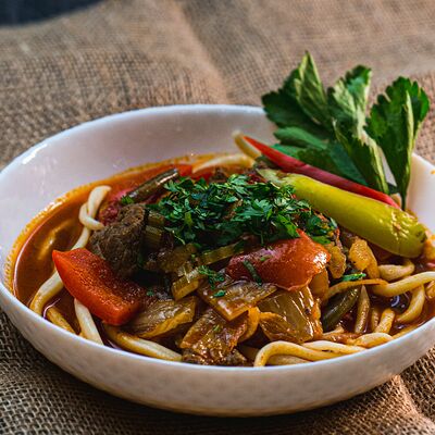 Говядина, болгарский перец, пекинская капуста, сельдерей, стручковая фасоль, помидор, чеснок, лапша лагманная
