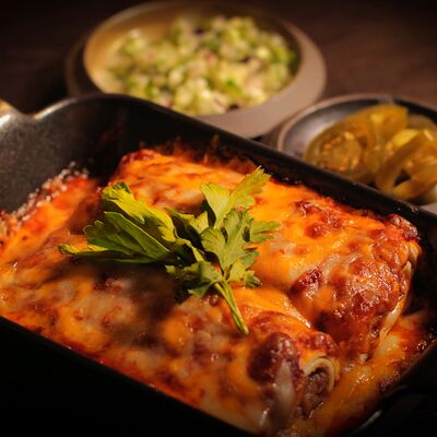 Рваная свинина с картофельными дольками под сырным соусом доставка