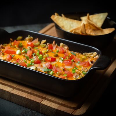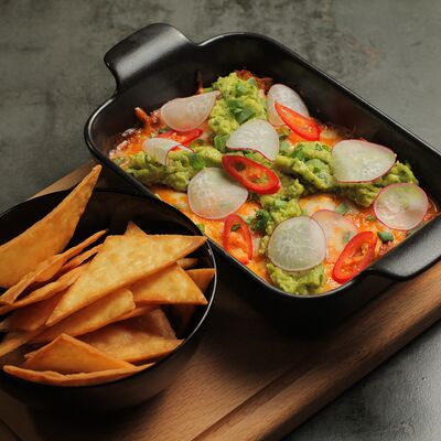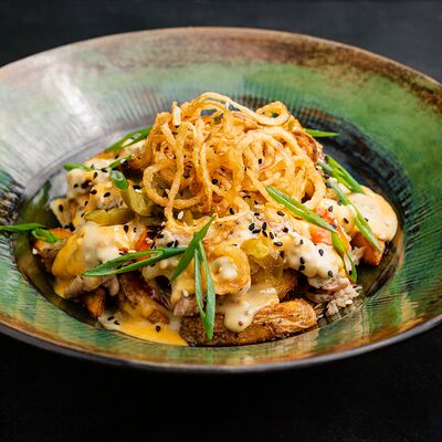 Рваная свинина, картофельные дольки, перец халапеньо, домашний сырный соус, соус сливочная горчица, соус шри-рача, сыр пармезан, лук фри