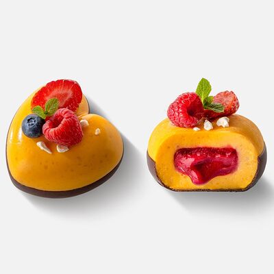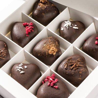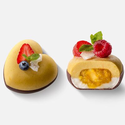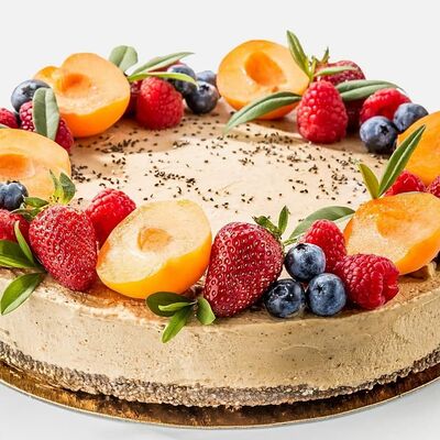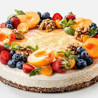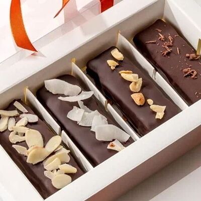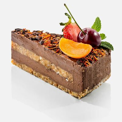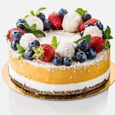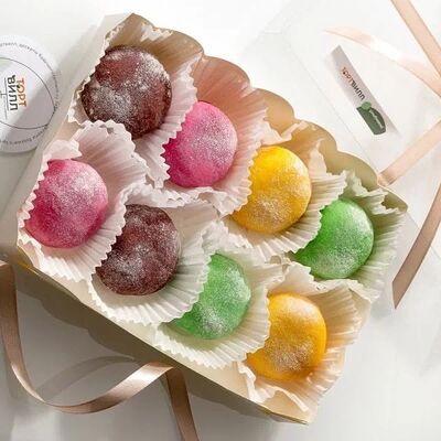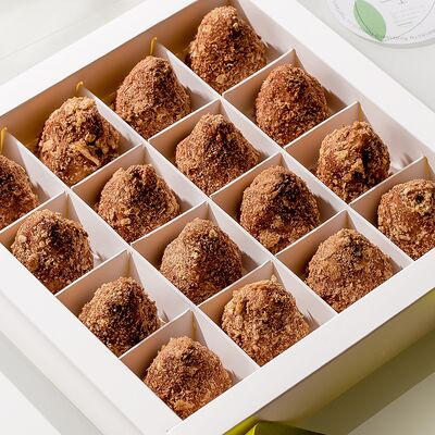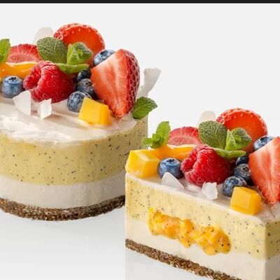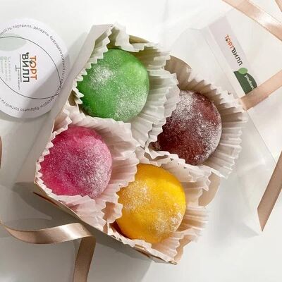 Японская матча, кокосовая мякоть, какао бобы, сироп топинамбура, свежая маракуйя в начинке. Без добавления сахара, муки и консервантов. Только натуральные ингредиенты