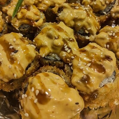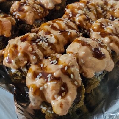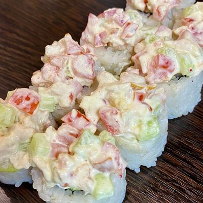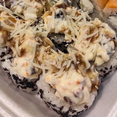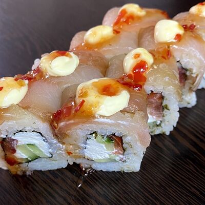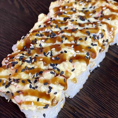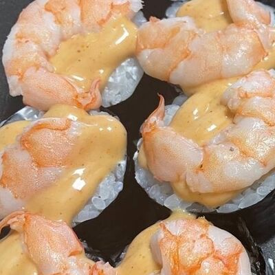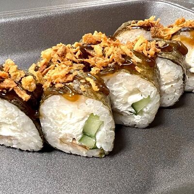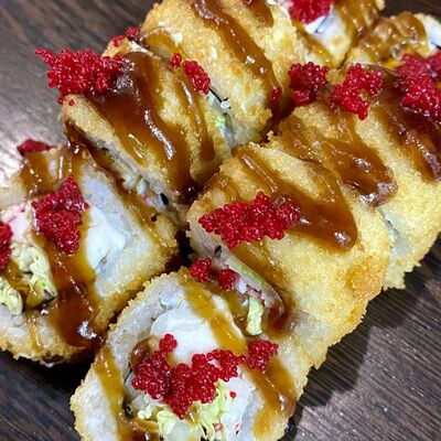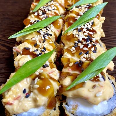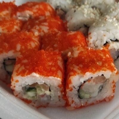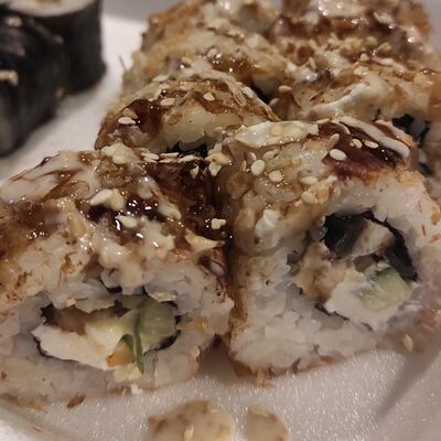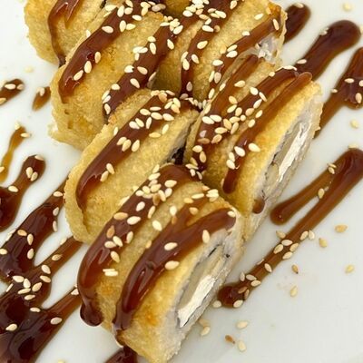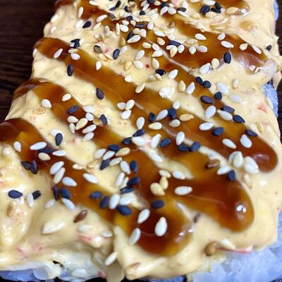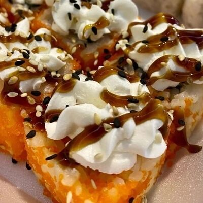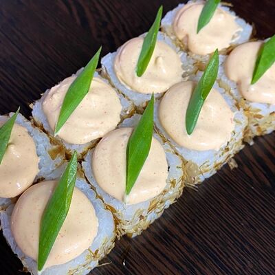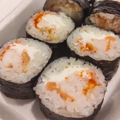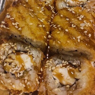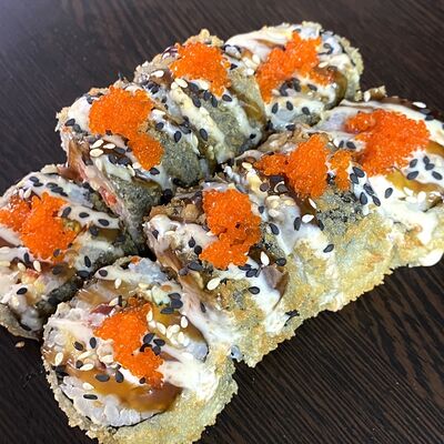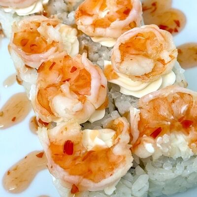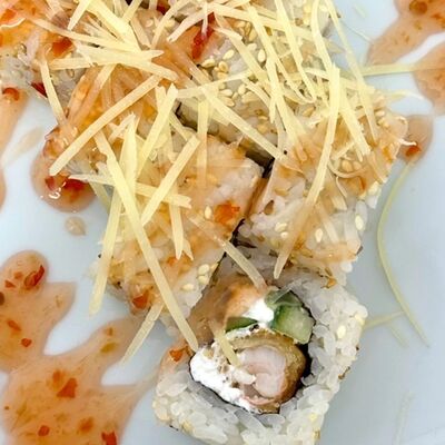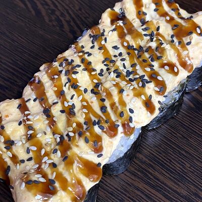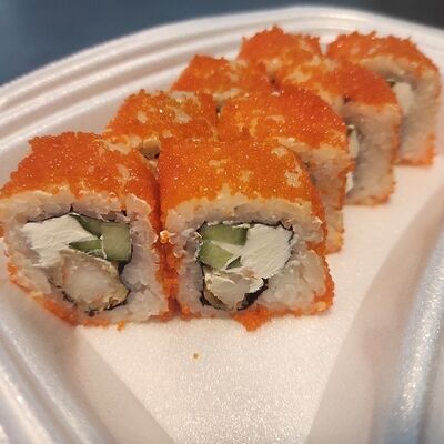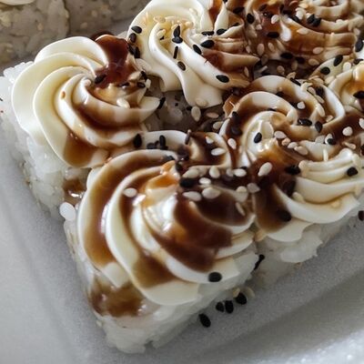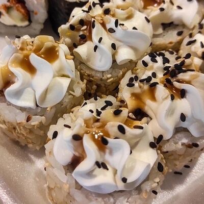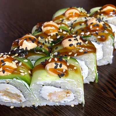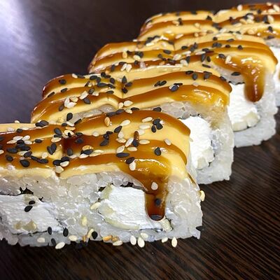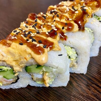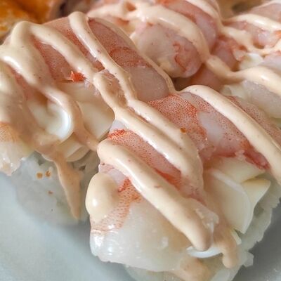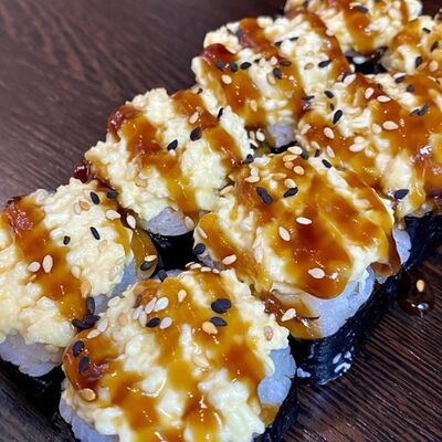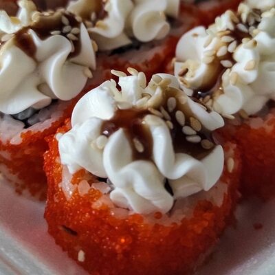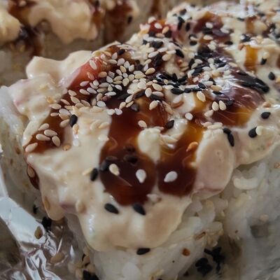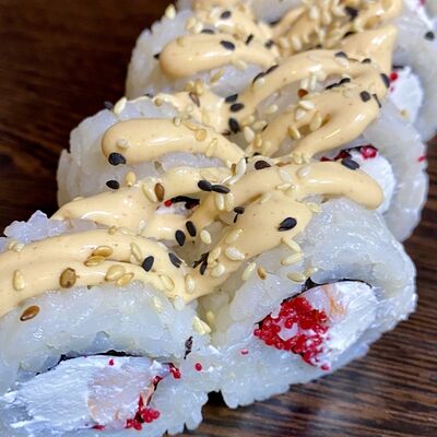 Рис, нори, майонез, темпурная креветка, огурец, острый соус из филе белой рыбы, унаги-соус, кунжут белый
