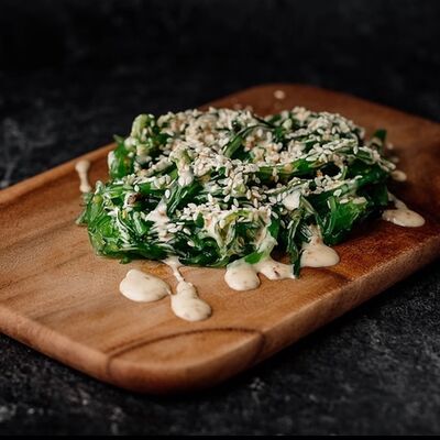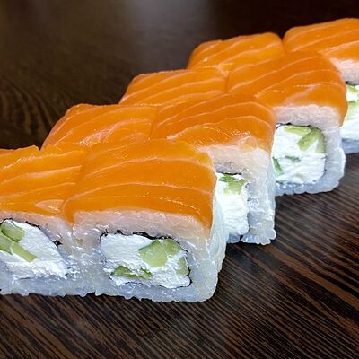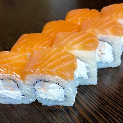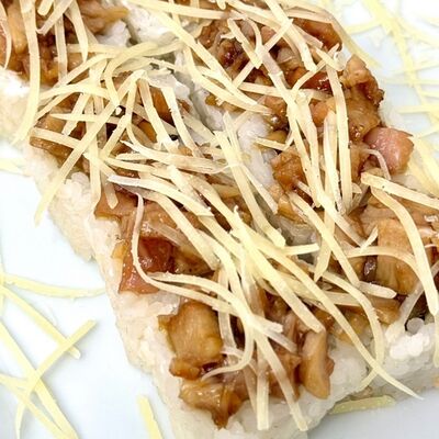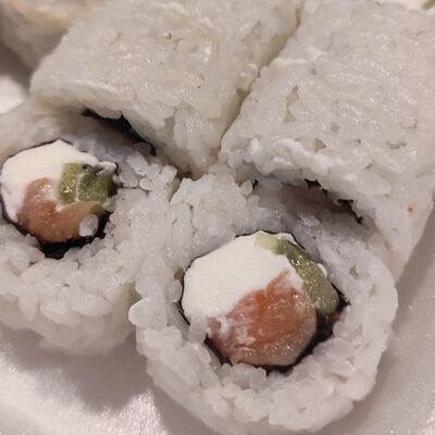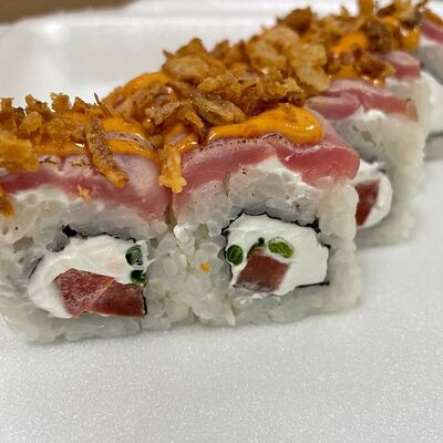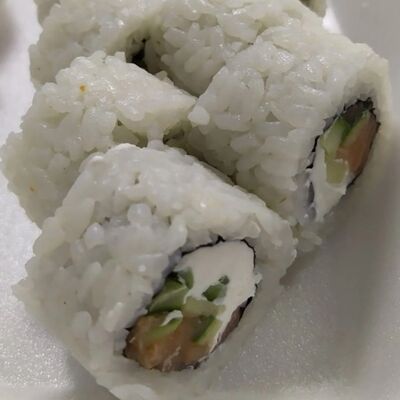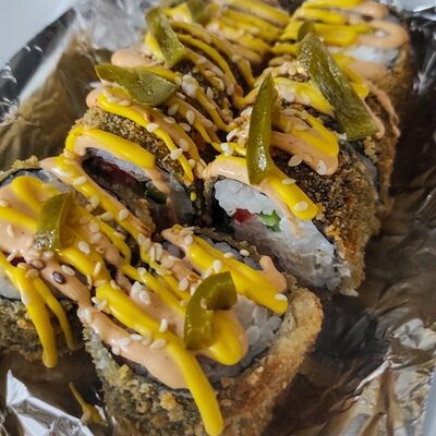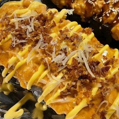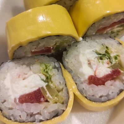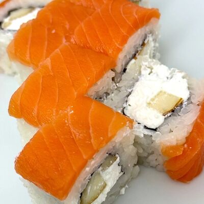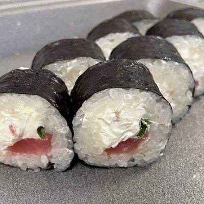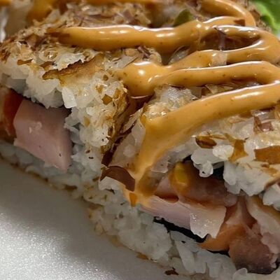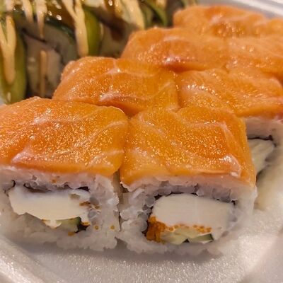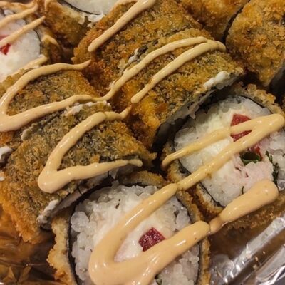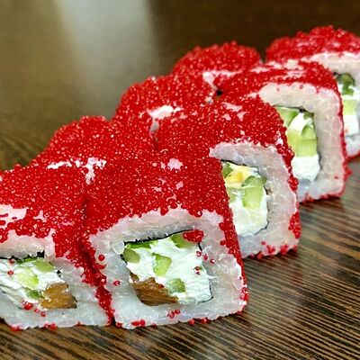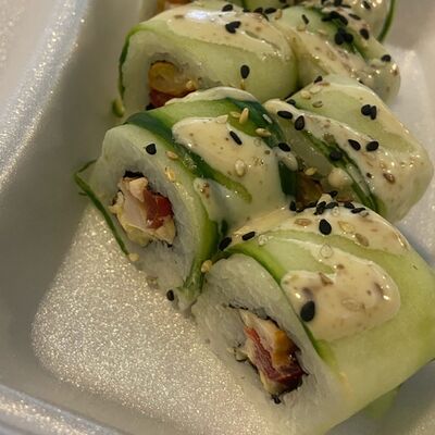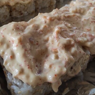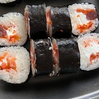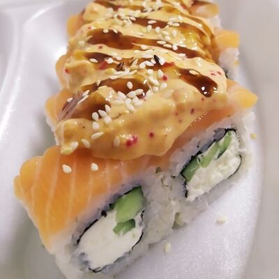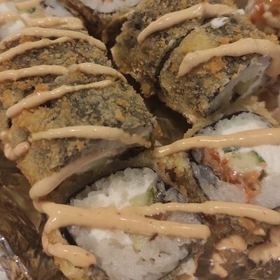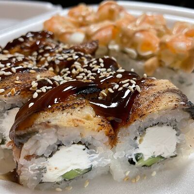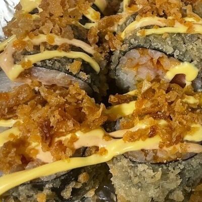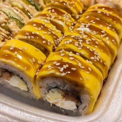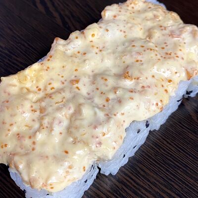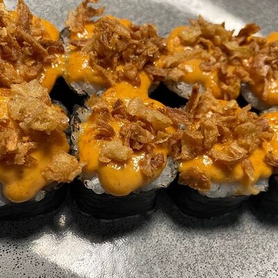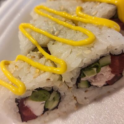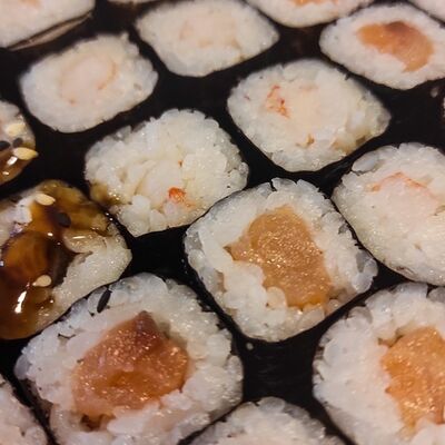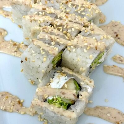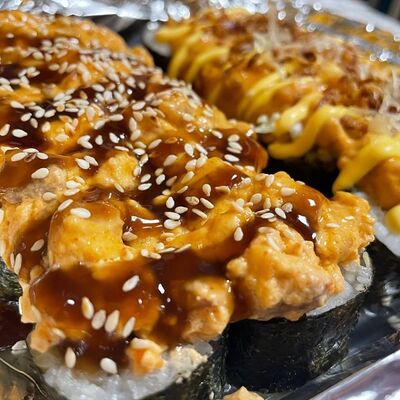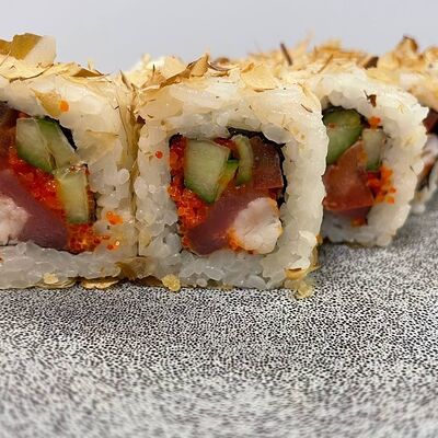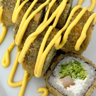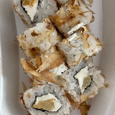 Рис, нори, майонез, темпурная креветка, огурец, острый соус из филе белой рыбы, унаги-соус, кунжут белый
