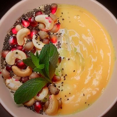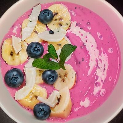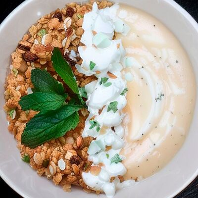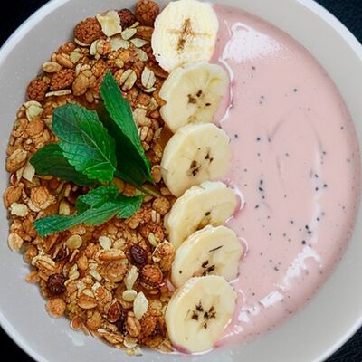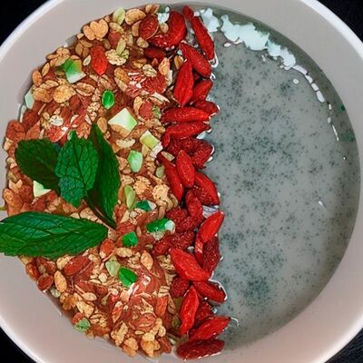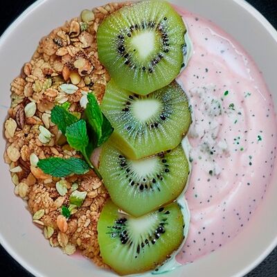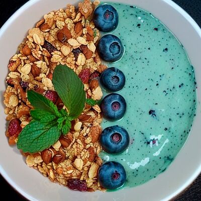 Йогурт, киви, банан, гранола, семена чиа, голубика, мята, спирулина