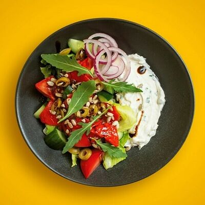 Томат, огурец, печеная паприка, оливки, соус фета, руккола, айсберг, семечки подсолнуха, оливковое масло со специями, бальзамический крем