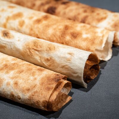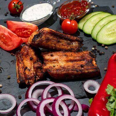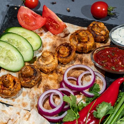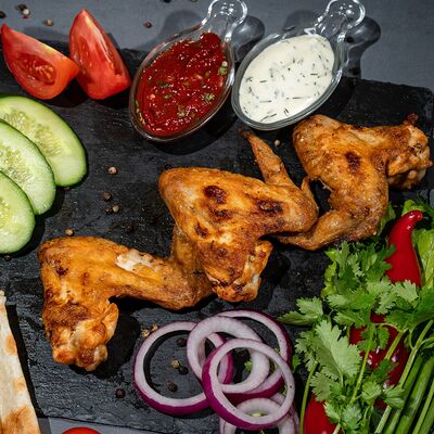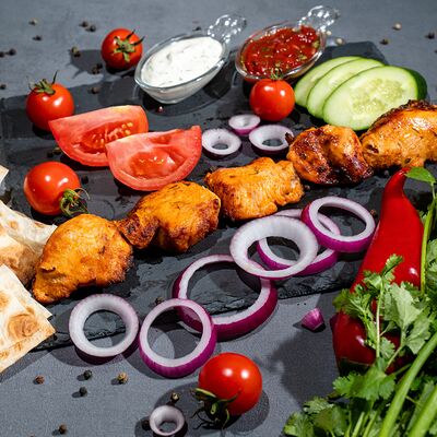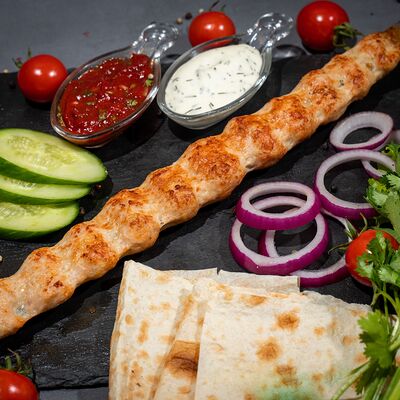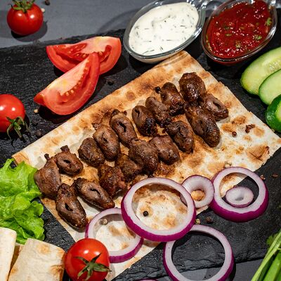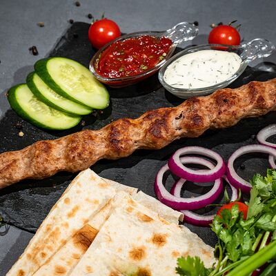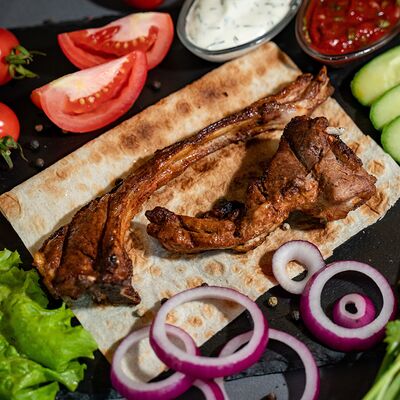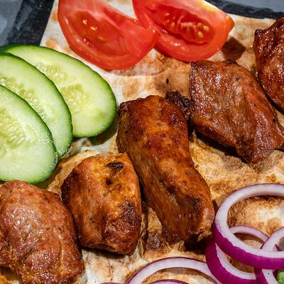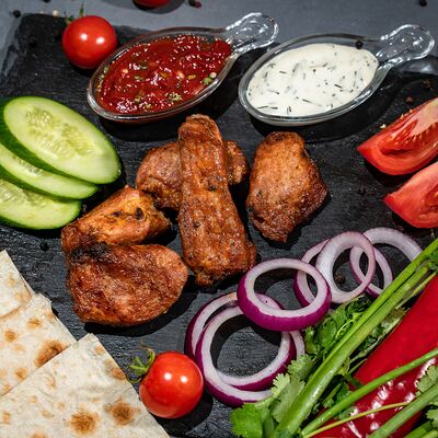 Подается с лавашем, огурцами, помидорами, луком и зеленью