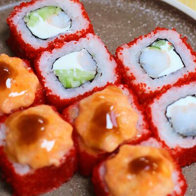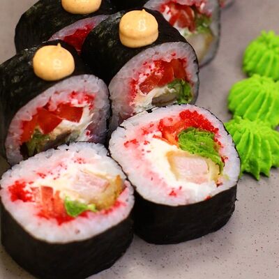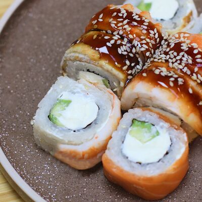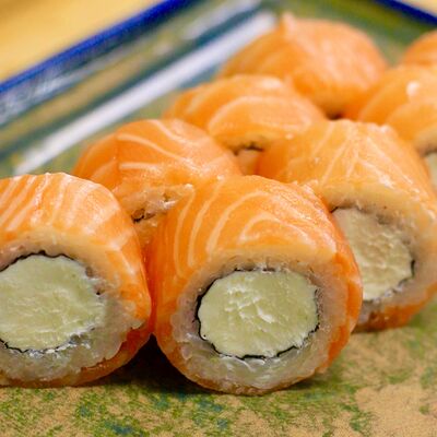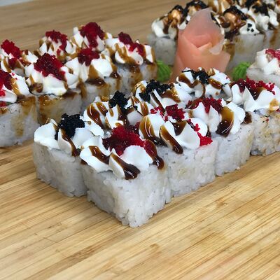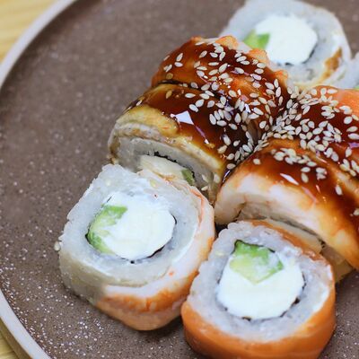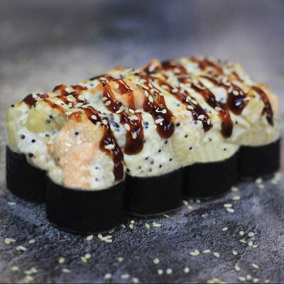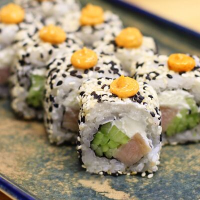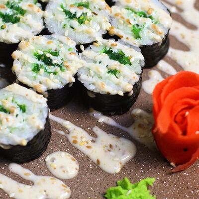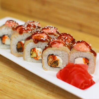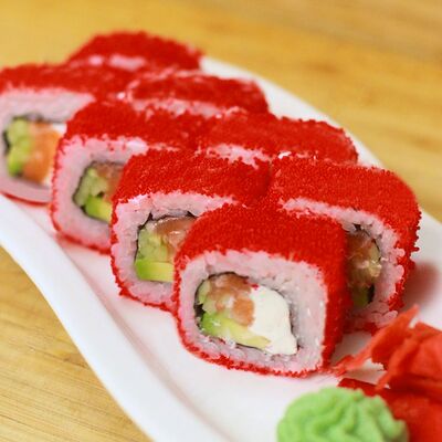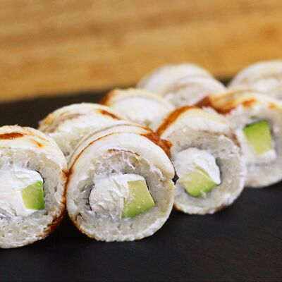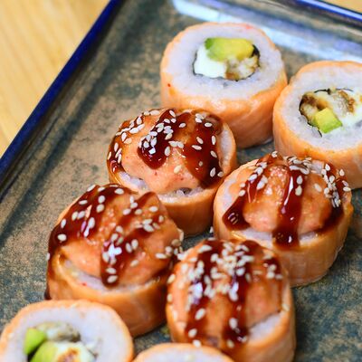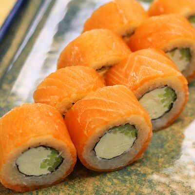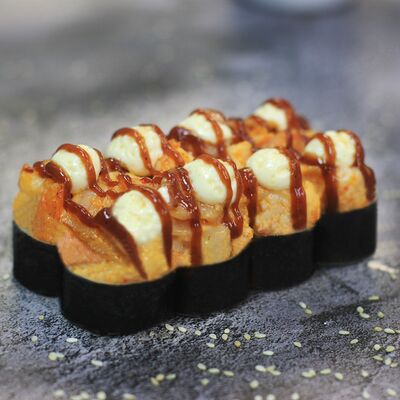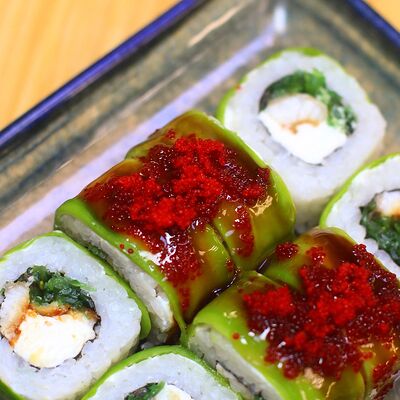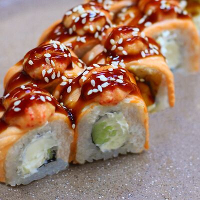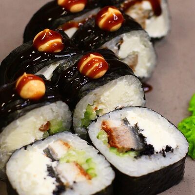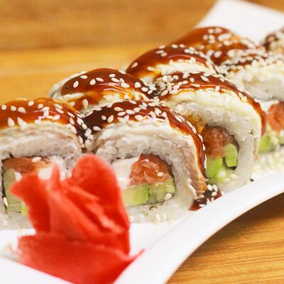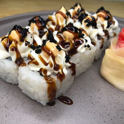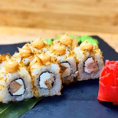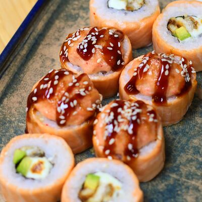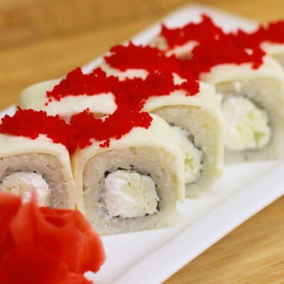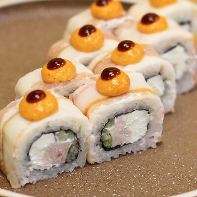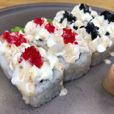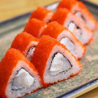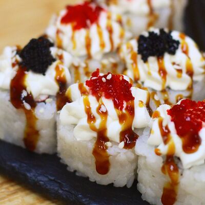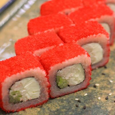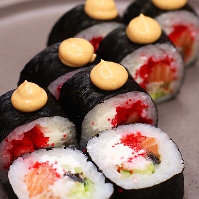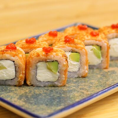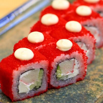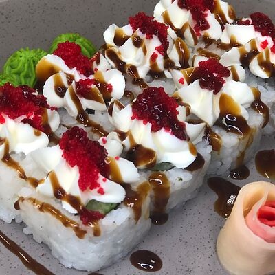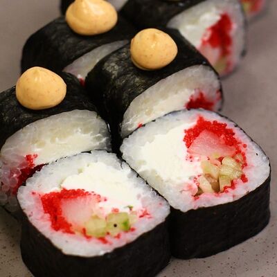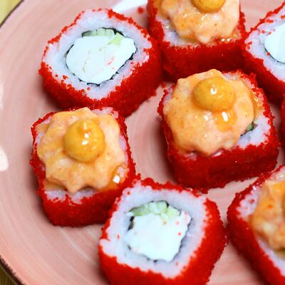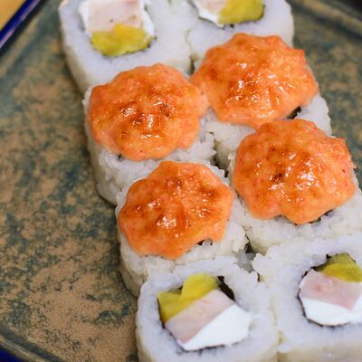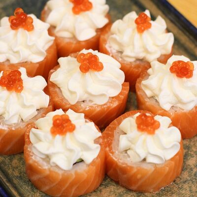 Ролл с лососем, угрем, огурцом, икрой тобико, сливочный сыром Cremette, соусом спайси и зелёным луком