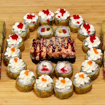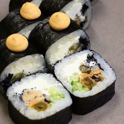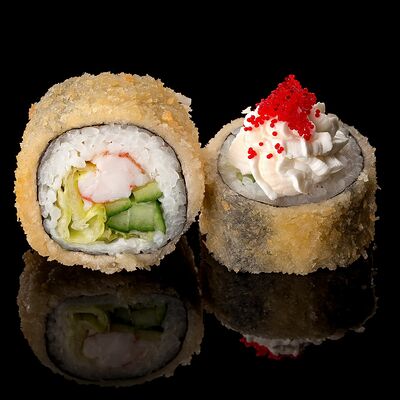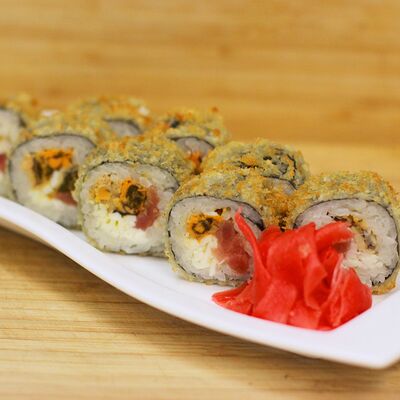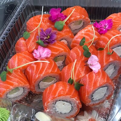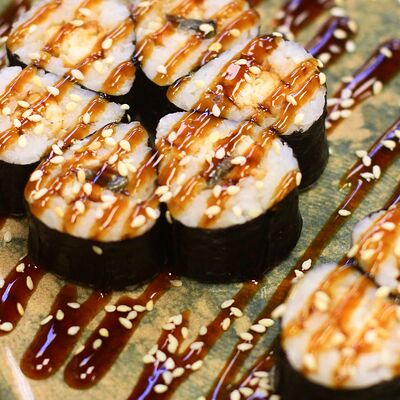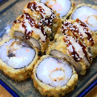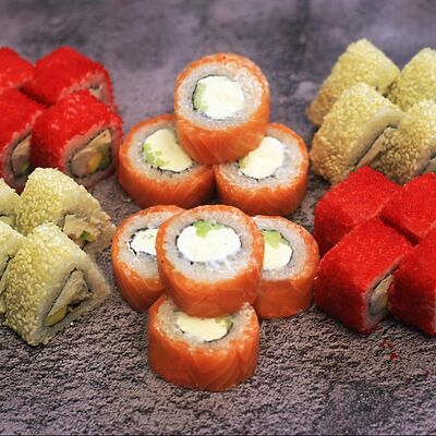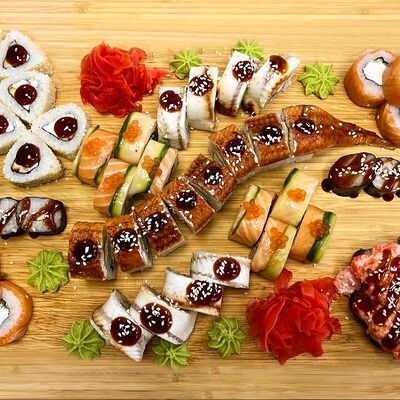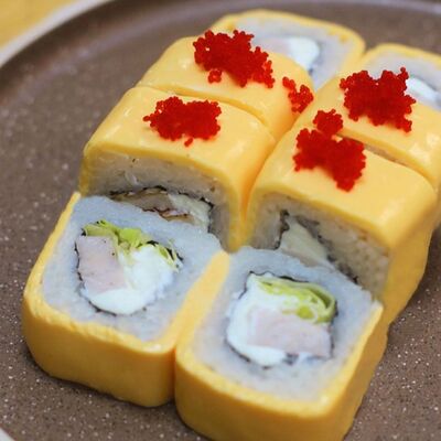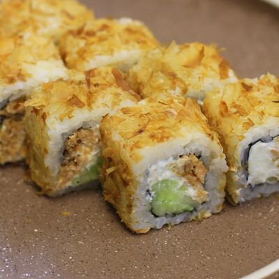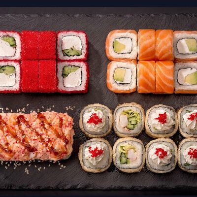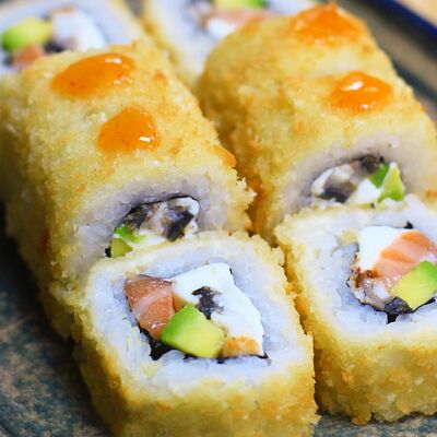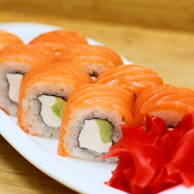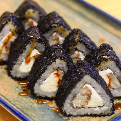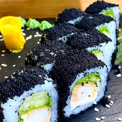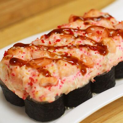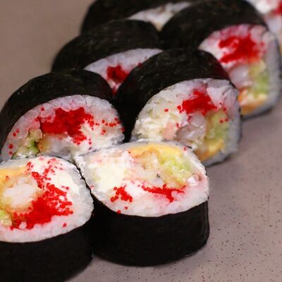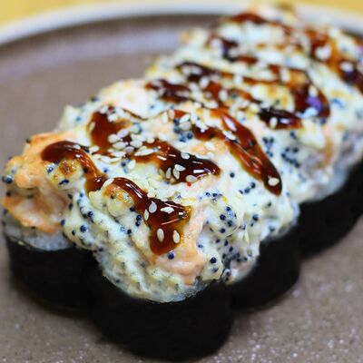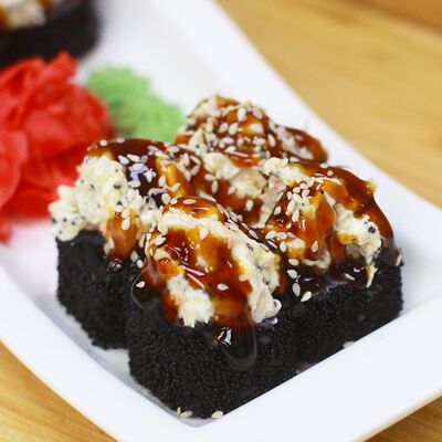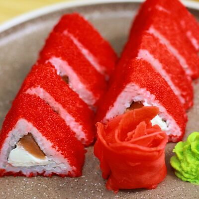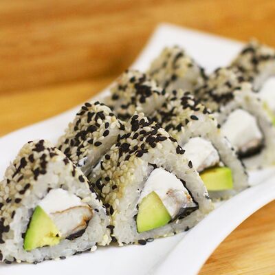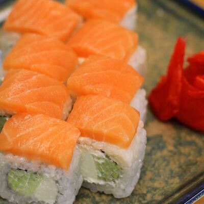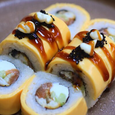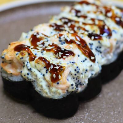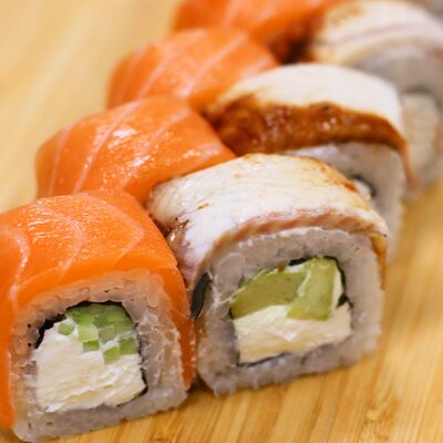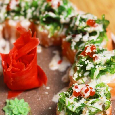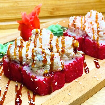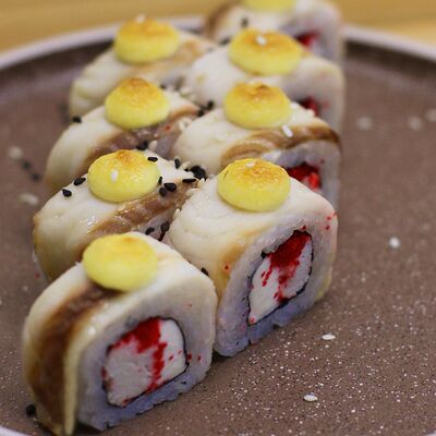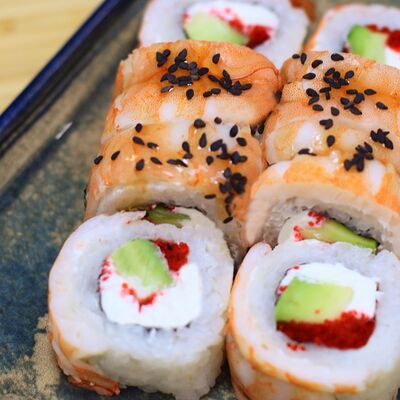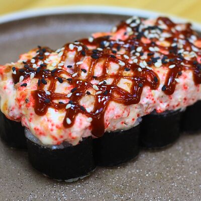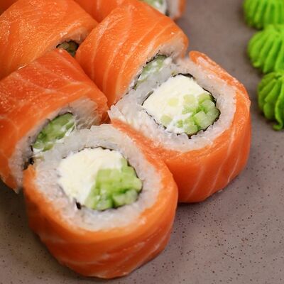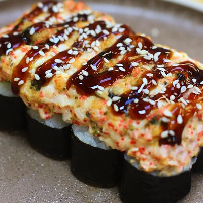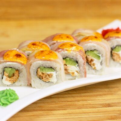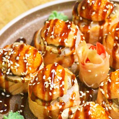 Ролл с лососем, угрем, огурцом, икрой тобико, сливочный сыром Cremette, соусом спайси и зелёным луком
