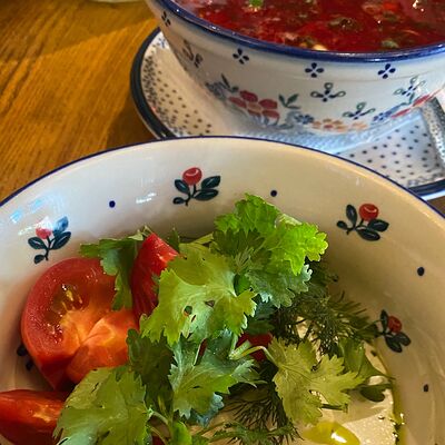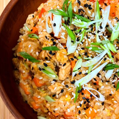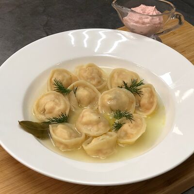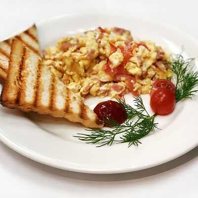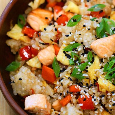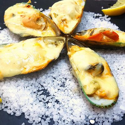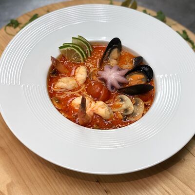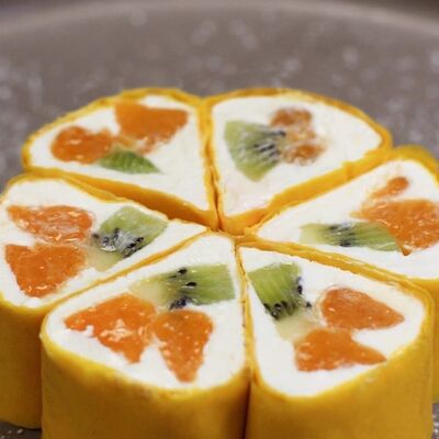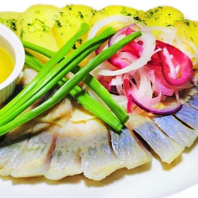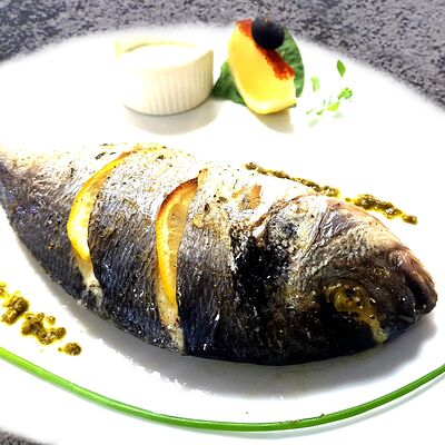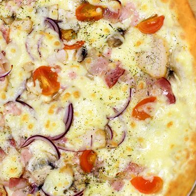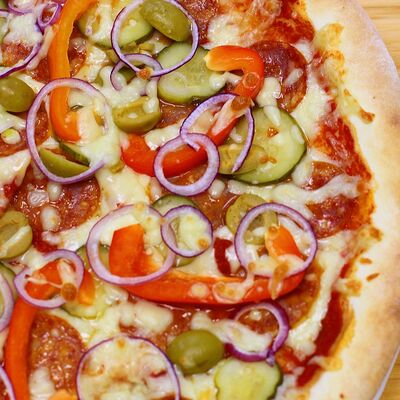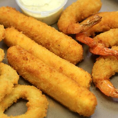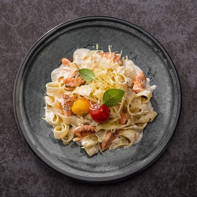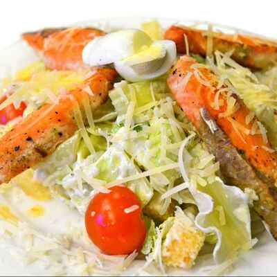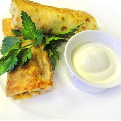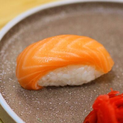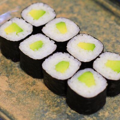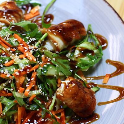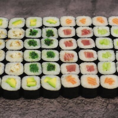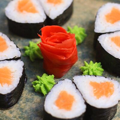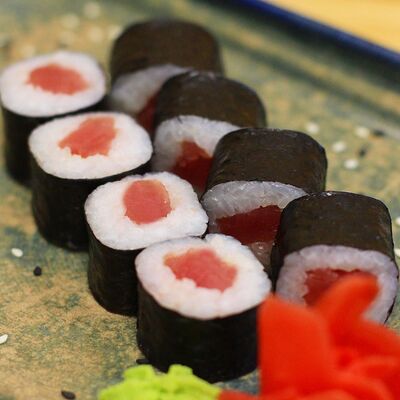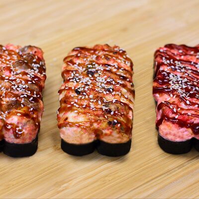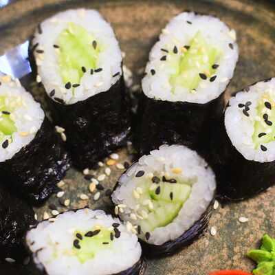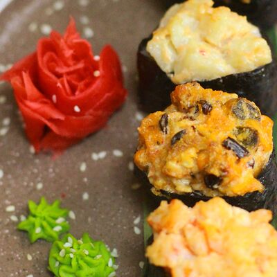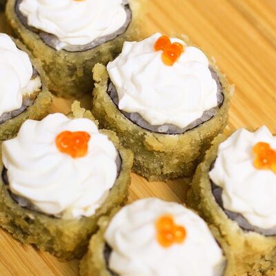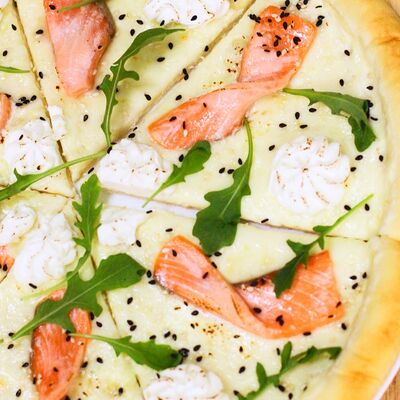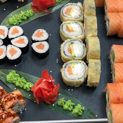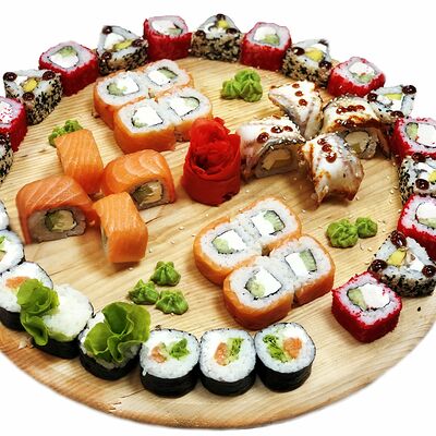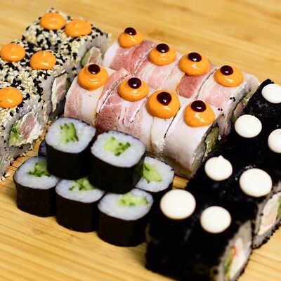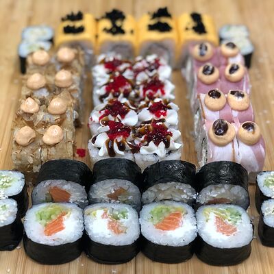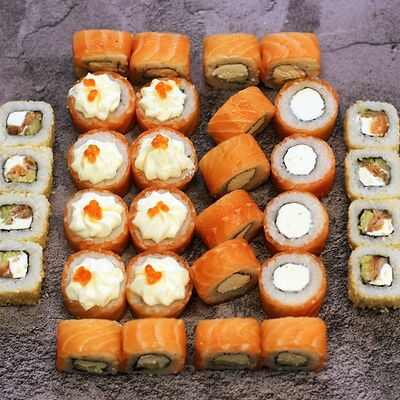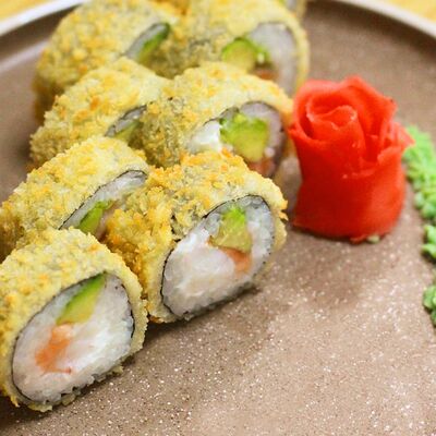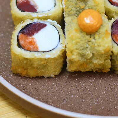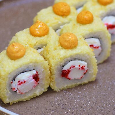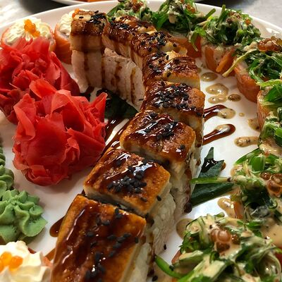 Ролл с лососем, угрем, огурцом, икрой тобико, сливочный сыром Cremette, соусом спайси и зелёным луком
