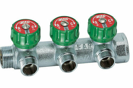 Хромированный модульный коллектор с 3 отводами серии MultiFAR. Снабжён регулирующими вентилями с двусторонним диском СИНИЙ-КРАСНЫЙ и диском с обозначением для сантехнических установок или отопительных систем. Особенность данного коллектора в плоском уплотнении. Через накидную гайку можно подключить любой тип трубы. В отличии от коллекторов с евроконусом к данному коллектору не требуется адаптер для перехода. Коллектор позволяют не только полностью открыть/закрыть поток, но и точно регулировать расход по каждому потребителю. Коллекторы со встроенными регулирующими вентилями можно ставить на подающую и обратную линию. Регулирование расхода производится без использования специальных инструментов. Технические характеристики: 3/4"В х 3 отвода 1/2"Н х 3/4"Н Диапазон рабочей температуры: +5 +100°С Рабочее давление: 10 бар Расстояние между отводами: 45 мм Материал: латунь хромированная Страна: Италия