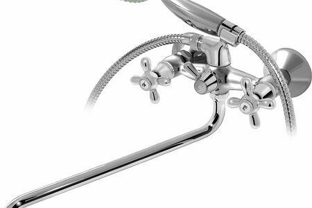 Смеситель универсальный двухзахватный настенный для ванны/раковины: - душевая лейка на гибком шланге; - керамический переключатель душ/излив; - керамическая кран-букса; - круглый излив; - держатель, встроенный в корпус смесителя.