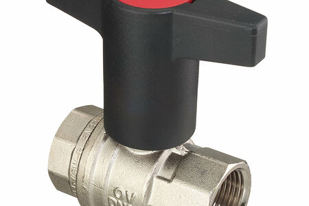 Шаровой кран из латуни, никелированный, полнопроходной. Рукоятка пластмассовая, удлиненная (антрацит), с красной крышкой для маркировки трубопровода . Шарик латунный, хромированный, уплотнение шарика - политетрафторэтилен (PTFE), уплотнительное кольцо- фторкаучук. Макс. рабочее давление: 16 бар, для холодной воды 20 бар. Рабочая температура: от -10 °C до 100 °C. kvs: 43