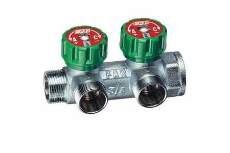 Хромированный модульный коллектор с 2 отводами серии MultiFAR. Снабжён регулирующими вентилями с двусторонним диском СИНИЙ-КРАСНЫЙ и диском с обозначением для сантехнических установок или отопительных систем. Особенность данного коллектора в плоском уплотнении. Через накидную гайку можно подключить любой тип трубы. В отличии от коллекторов с евроконусом к данному коллектору не требуется адаптер для перехода. Коллектор позволяют не только полностью открыть/закрыть поток, но и точно регулировать расход по каждому потребителю. Коллекторы со встроенными регулирующими вентилями можно ставить на подающую и обратную линию. Регулирование расхода производится без использования специальных инструментов. Технические характеристики: 3/4"В х 2 отвода 1/2"Н х 3/4"Н Диапазон рабочей температуры: +5 +100°С Рабочее давление: 10 бар Расстояние между отводами: 45 мм Материал: латунь хромированная Страна: Италия
