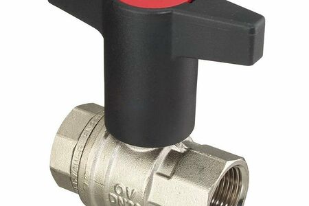 Полнопроходной шаровой кран Oventrop Optibal 1077104 1/2" ВР/ВР с внутренней резьбой оснащён высокой Т-ручкой из пластамассы цвета антрацит с вмонтированной в неё красной крышкой с надписью "Oventrop". Выполняет запорно-регулирующую функцию в системах водоснабжения, отопления и охлаждения. Размер резьбового присоединения составляет 1/2", условный диаметр трубы - 15 мм.