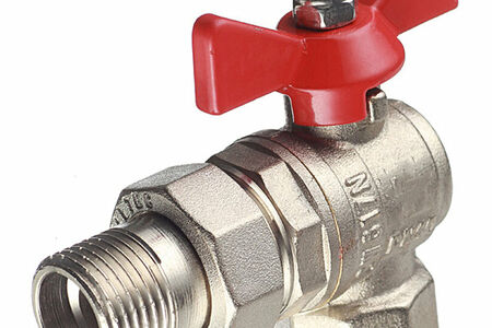 Угловой полнопроходной ремонтопригодный шаровой кран с увеличенным ресурсом. Соединен накидной гайкой с резьбовым полусгоном. Корпуса деталей - латунные, никелированные. Кран оснащен ручкой типа бабочка с утолщенной стенкой из алюминиевого сплава и эпоксидным покрытием красного цвета. Резьба присоединений - внутренняя/наружная.