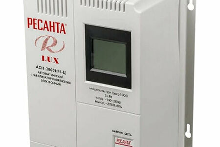 Стабилизатор напряжения Ресанта АСН 3000 Н/1-Ц Lux используется для выравнивания входного напряжения и защиты приборов от высоких скачков напряжения с суммарной мощностью до 3 кВт. В конструкции предусмотрены фильтрация частотных помех на входе и выходе, аварийное отключение нагрузки и высокая скорость срабатывания защиты для максимальной безопасности подключенных приборов. Работой стабилизатора управляет встроенный микропроцессор. Стабилизатор Ресанта АСН-3000Н/1-Ц Lux способен работать в однофазной сети, поддерживая суммарную нагрузку до 2400 Вт. Это делает его оптимальным выбором для подключения одного или двух устройств, наиболее чувствительных к перепадам тока в сети. Прибор может эксплуатироваться в широком диапазоне входящих напряжений от 140 до 260 В и отличается молниеносной реакцией, составляющей всего 20-35 мсек. Благодаря этому, стабилизатор будет надежно защищать устройства как от длительных перепадов, так и от резких коротких импульсов. Прибор чрезвычайно прост и удобен в использовании, поэтому для его монтажа не потребуется помощь электрика. Характеристики Диапазон входного напряжения, В 140-260 Номинальная величина выходного напряжения, В 220 8% Номинальная мощность при Uвх?190 В (кВт) 3 Рабочая частота (Гц) 50 / 60 КПД, при нагрузке 80% не менее 97 Точность поддержания выходного напряжения (%) 8 Масса нетто (кг) 8,9 Охлаждение естественное Время регулирования (мс) 5-7 Искажение синусоиды отсутствует Высоковольтная защита (В) 260 5 Класс защиты IP 20 (негерметизирован) Габаритные размеры, ДхШхВ (мм) 260х155х310 Рабочая температура окружающей среды (оС) 0-45 Относительная влажность воздуха, не более (%) 80
