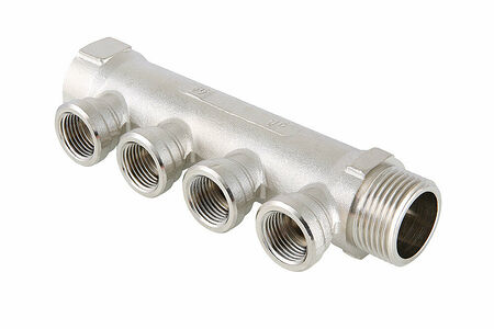 Никелированный коллектор для воды и других сред, неагрессивных к материалам изделия. Изготовлен из качественной сантехнической латуни марки CW617N (европейский стандарт ЕN 12165). Имеет 4 выхода диаметром 1/2" с внутренней резьбой. Диаметр коллектора - 1", резьба - внутренняя/наружная. Рабочая температура - до 130 °С, давление - до 16 бар. Применение коллектора позволяет отказаться от дополнительной запорной, регулирующей арматуры и уплотнений, облегчает проектирование, монтаж и наладку оборудования. В водоснабжении коллектор обеспечивает равное давление для потребителей, исключая их влияние друг на друга. Коллектор отопления гарантирует поступление требуемого количества тепла к отопительным приборам и контурам теплого пола.