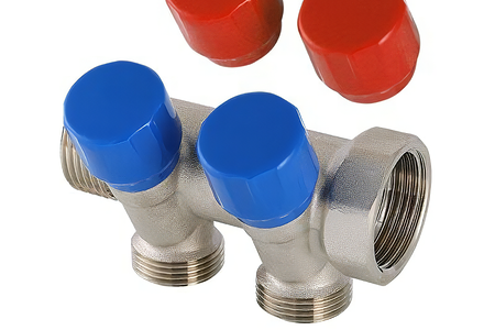 Латунный никелированный коллектор на 2 выхода диаметром 3/4" с наружной резьбой, стандарт присоединения - евроконус . На каждом выходе предусмотрен вентиль для регулирования расхода рабочей среды. Диаметр коллектора - 1", резьба - внутренняя/наружная. Ремонтопригодный. Рабочая температура теплоносителя - до 110 °С, давление - до 10 бар. Применяется для распределения потоков жидкостей в контурах теплого пола, радиаторного отопления, холодного и горячего водоснабжения. Комплектуется набором ручек вентилей красного и синего цвета.