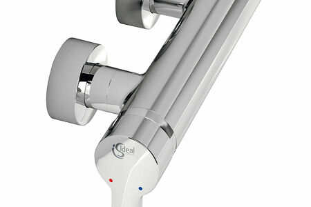 -Смеситель для душа настенный монтаж на цилиндр.гайках и металлических накладках -картридж 47 мм IS с функцией CLICK (ограничение потока воды) -с функцией HWTC (ограничение максимальной температуры горячей воды) -без душевого гарнитура -металлическая рукоятка с индикатором горячей / холодной воды -встроенный обратный клапан
