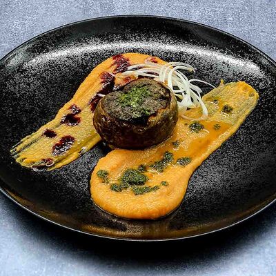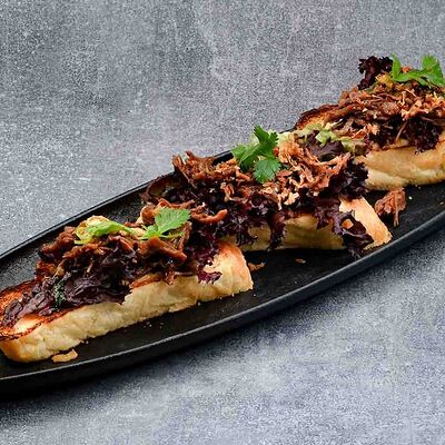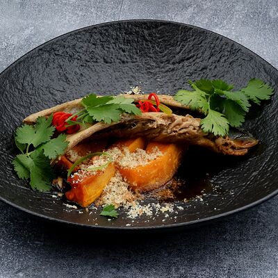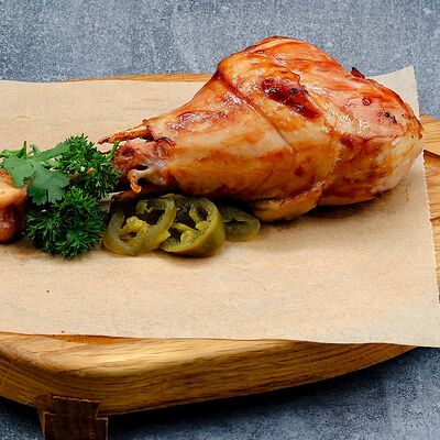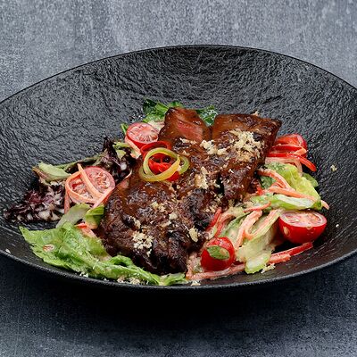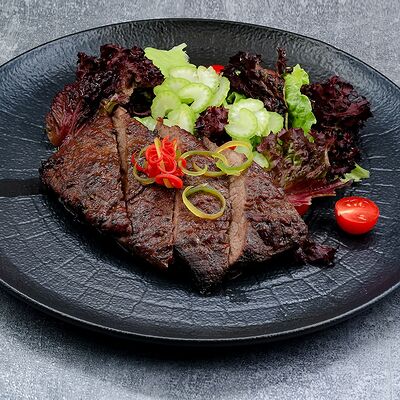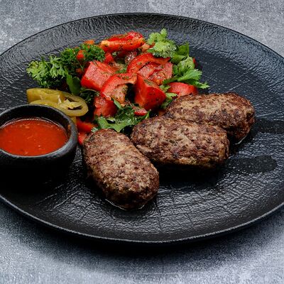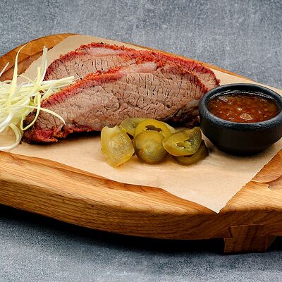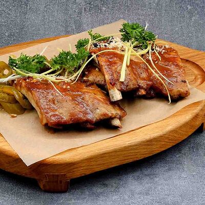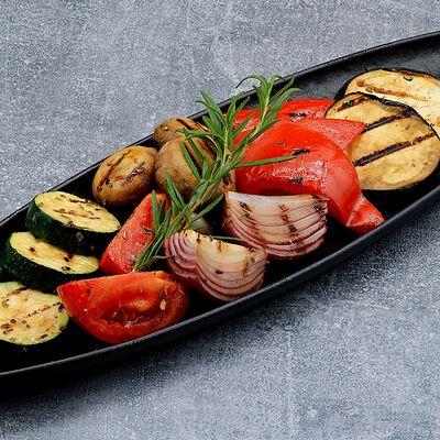 Голень индейки, половина утки, говяжья грудинка, говядина фланк стейк, свиные рёбра, баклажаны, томаты розовые, лук красный, халапеньо маринованный, соус огонь, соус манго айоли, соус охра, соус барбекю