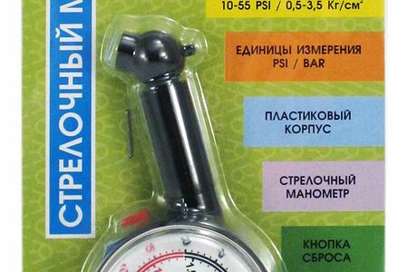 Манометр Вымпел МН-02 5086 позволяет измерить давление в шинах легковых и грузовых авто, мотоциклов и велосипедов. Он выполнен из ударопрочного пластика и имеет угловую форму прижимного клапана. Для проверки давления необходимо плотно прижать манометр к вентилю шины и считать его показания. Шкала измерения: 0-3.5 кгс/см2
