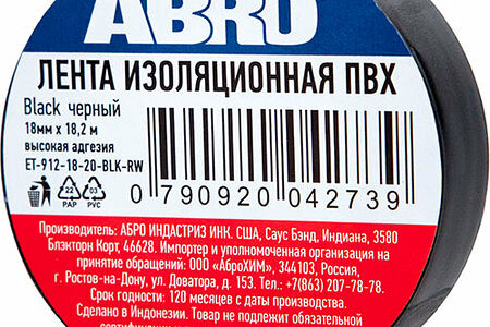 Эластичная изоляционная лента Abro из ПВХ.Сфера применения: предназначена для изоляции проводов низкого напряжения, намотки пучков проводки, маркировки.Свойства:высокая прочность и эластичность;высокая адгезия благодаря качественному клеевому составу;влагостойкая;предотвращает коррозию и разрушение материалов;обеспечивает надежную механическую и электроизоляционную защиту при минимальном количестве слоёв намотки.