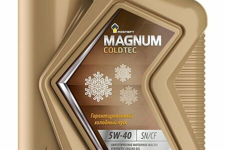 Rosneft Magnum Coldtec 5W-40 –синтетическое моторное масло. Надежно защищает детали двигателя в период масляного голодания, имеет меньшую вязкость при прокачивании масляным насосом и быстрее создает необходимое давление в масляной системе.