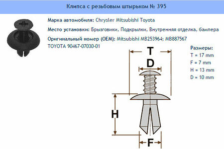 Клипса № 395 Clipston / Autokrep Chrysler Mitsubishi / Крайслер, Митсубиси Брызговики-Подкрылки, Внутренняя отделка, Кузов (бампера), 10 шт доставка