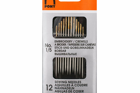 Набор Pony 'Embroidery/Crewels' включает в себя 12 стальных острых игл разных размеров. Набор предназначен для шитья, мелкого ремонта и вышивания в различных техниках. Благодаря тонкому стержню и идеальной гладкой поверхности, иглы идеально подходят для работы с гобеленовыми тканями. Ушко иглы позолочено, поэтому вдевать в него нить удобно даже при ослабленном зрении. Чтобы защитить пальцы от случайного травмирования, при работе с иглами используйте наперсток. Оптимальное место хранения игл – закрытый футляр или игольница с магнитным основанием.Длина игл: 48,5 -41,5 ммТолщина игл: 1,17-0,86 ммНомер игл: №1-5
