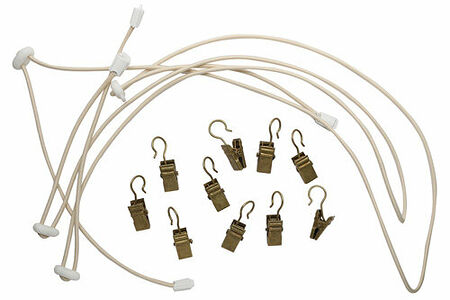 В наборе: шнур-резинка (2 шт.), металлические зажимы (10 шт.), пластиковые зажимы (4 шт.), пластиковые фиксаторы (4 шт.).
