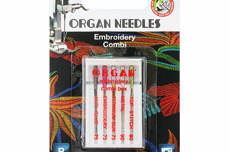 Набор ORGAN 5/COMBI Box - это комплект из разных игл: Anti-Glue №75, вышивальные №75, титаниум №75, игла для металлизированной нити №90, игла TOP STITCH №80.