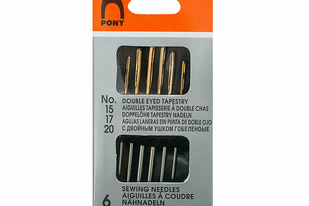 Набор Pony 'Double Eyed Tapestry' включает в себя 6 стальных игл с закругленным концом, предназначенных для ручного шитья на трикотажных материалах и гобеленах. Двойное ушко служит для удобства при выполнении швов и узоров двумя нитями разных цветов одновременно. Ушко иглы позолочено, поэтому вдевать в него нить удобно даже при ослабленном зрении.Чтобы защитить пальцы от случайного травмирования, при работе с иглами используйте наперсток. Оптимальное место хранения игл – закрытый футляр или игольница с магнитным основанием. Длина игл: 55 мм, 50,5 мм, 44 мм. Толщина игл: 1,83 мм, 1,42 мм, 1,09 мм. Номер игл: №15, 17, 20.