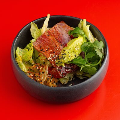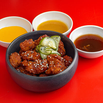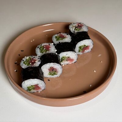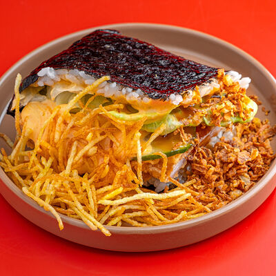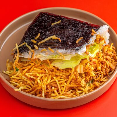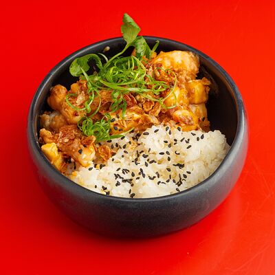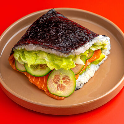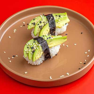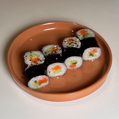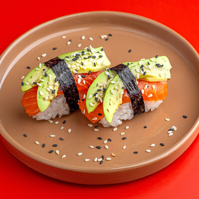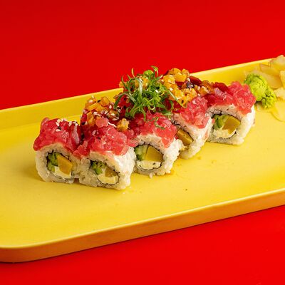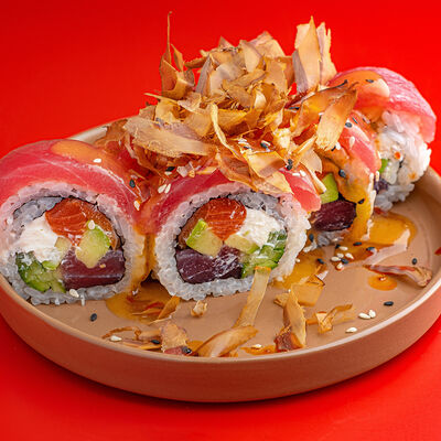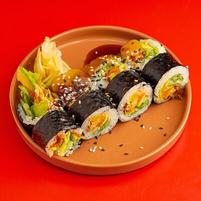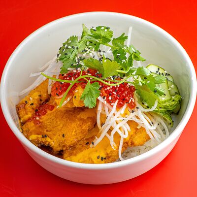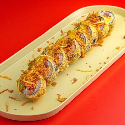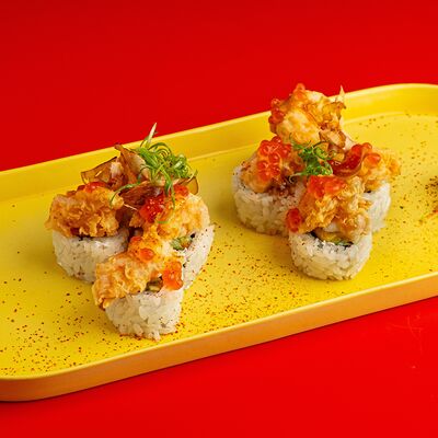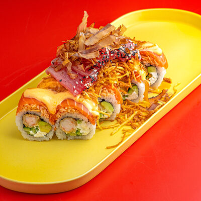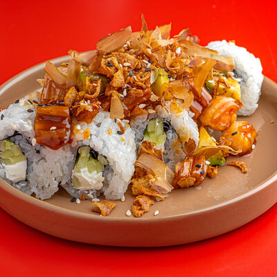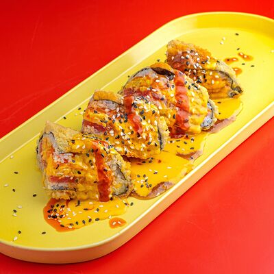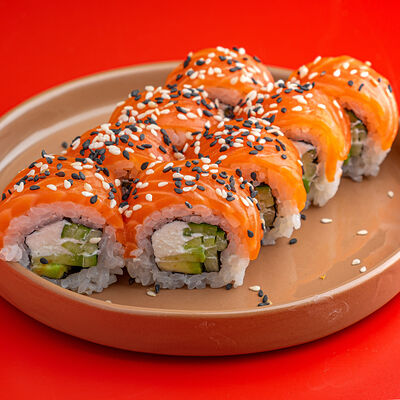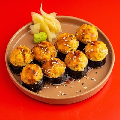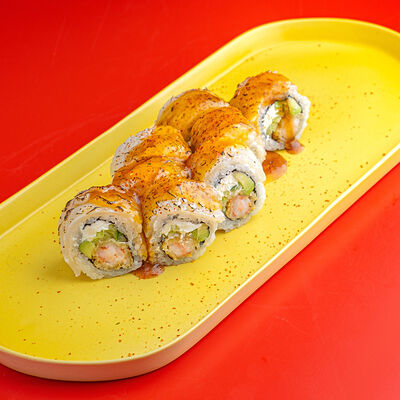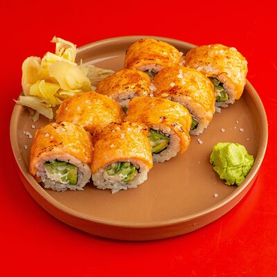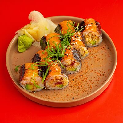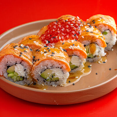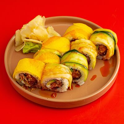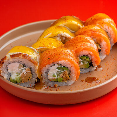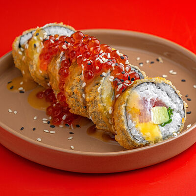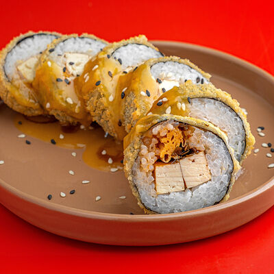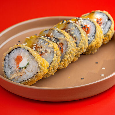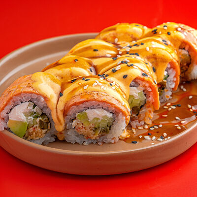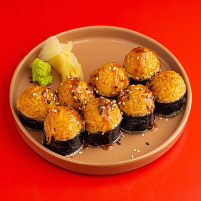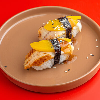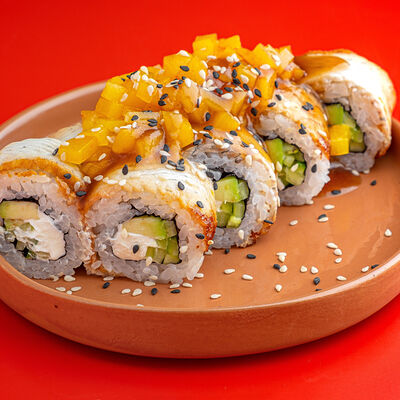 Рис, нори, лосось, угорь, кунжут, сливочный сыр, зеленый лук, панировка, унаги, персиковый соус, васаби