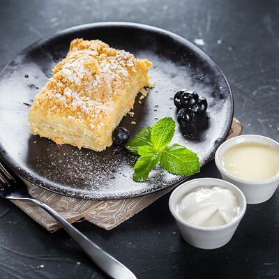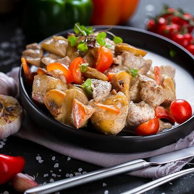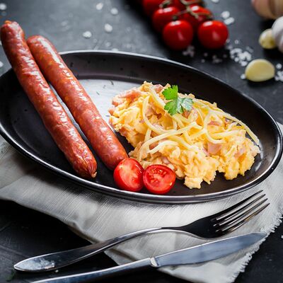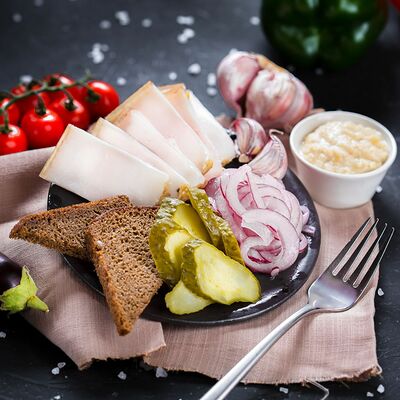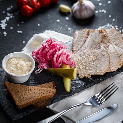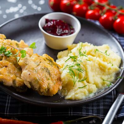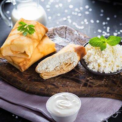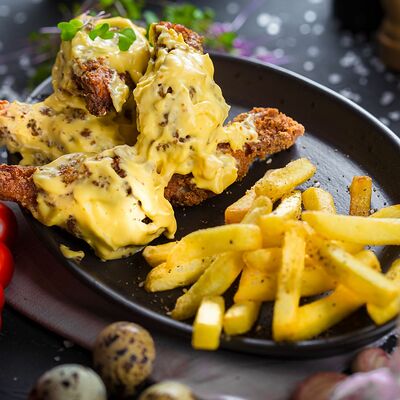 Грудинка свиная, сыр Гауда, мука, молоко, яйцо, соус