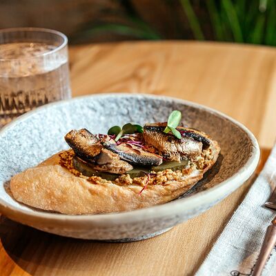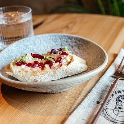 Гранола, смузи банановое-клубничное, мята, кокосовая стружка, голубика