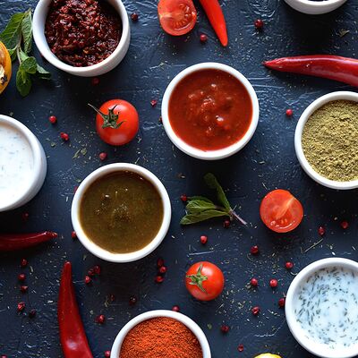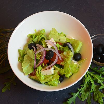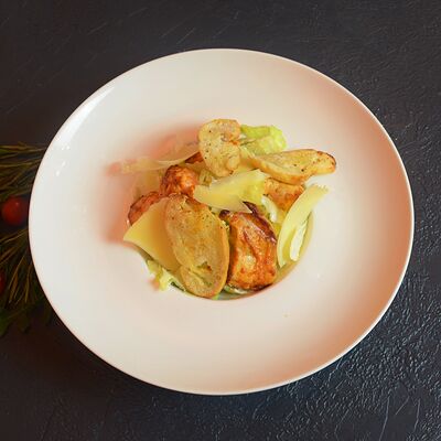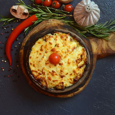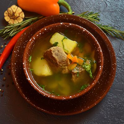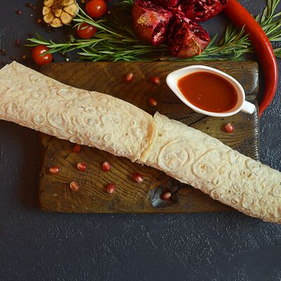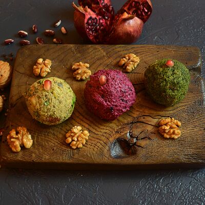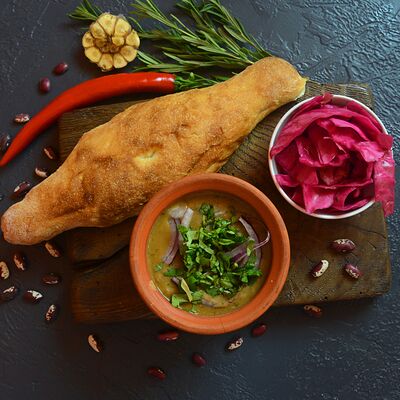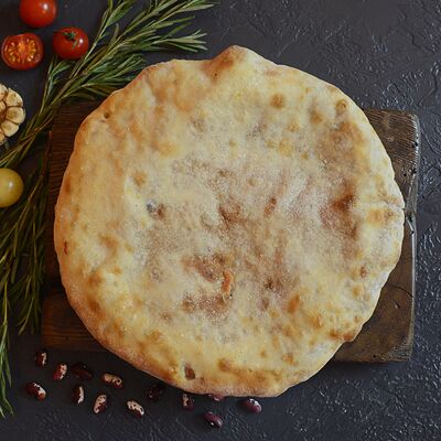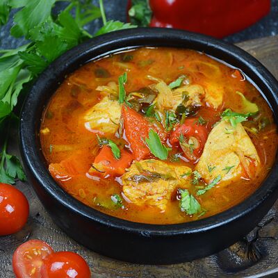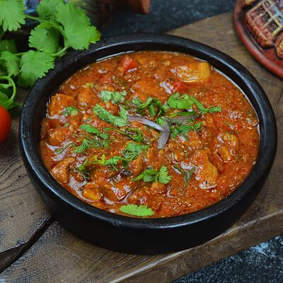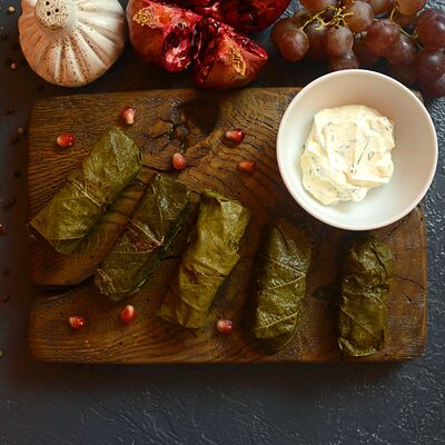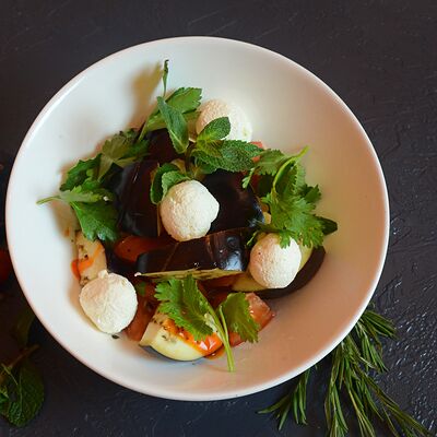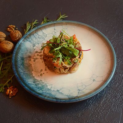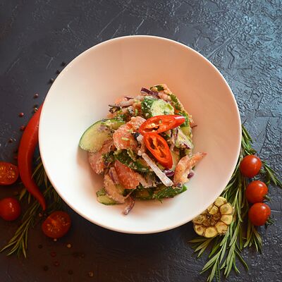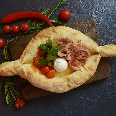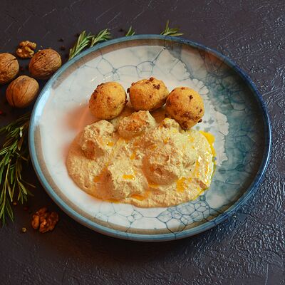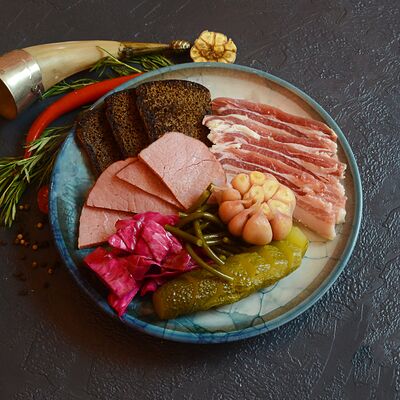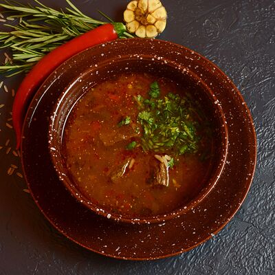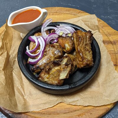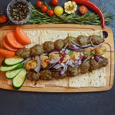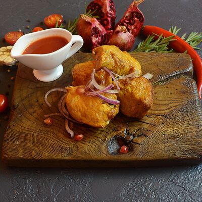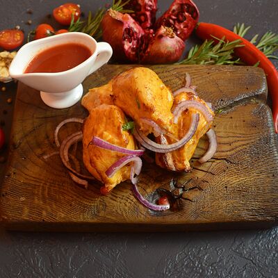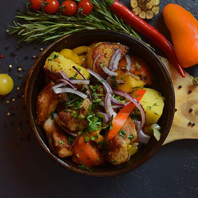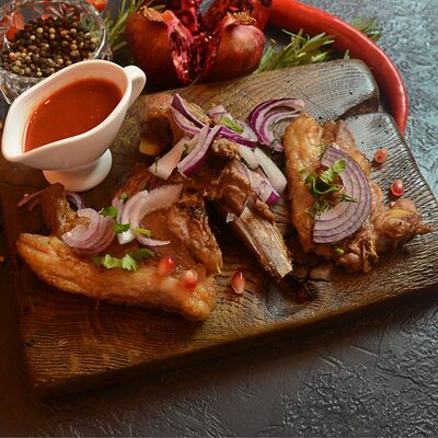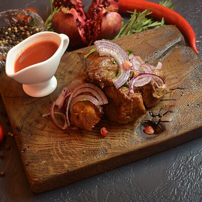 Нежная свинина в грузинском маринаде из белого вина и лукового сока, заправленного специями из Сванетии, Подаётся с гарниром из свежих огурцов и помидоров с соусом сацебели, декорируется луком, зеленью и гранатом