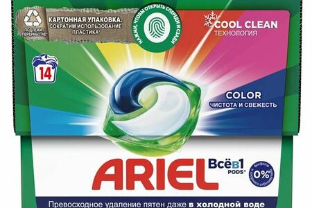 Капсулы для стирки ariel color 14 штук подходят для стирки цветного и белого белья. Благодаря уникальному многосекционному дизайну, превосходное очищение еще никогда не было удобнее. Каждая капсула содержит комплекс мощных активных ингредиентов для эффективного отстирывания. Все компоненты уже дозированы в оптимальной пропорции в 100% водорастворимой пленке. Достаточно лишь добавить капсулу в барабан стиральной машины до загрузки белья. Ariel капсулы содержат высокую концентрацию очищающих веществ: одной капсулы хватит для стирки 4-5 кг белья для стирки того же количества потребовалось бы 65 мл геля для стирки ariel. Преимущества жидкого средства для стирки ariel: прекрасно отстирывает сложные пятна даже при температуре 20c; невероятная чистота в одной капсуле для стирки; обеспечивает безупречное отстирывание и яркость цвета; превосходная чистота даже при 20c; простота использования: не нужно отмерять и наливать; не содержит фосфатов и хлорных отбеливателей. Капсулы ariel color также доступны в большой упаковке 45 и 60 штук с более выгодной ценой за каждую стирку. Храните упаковки капсул в месте, недоступном для детей.
