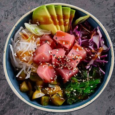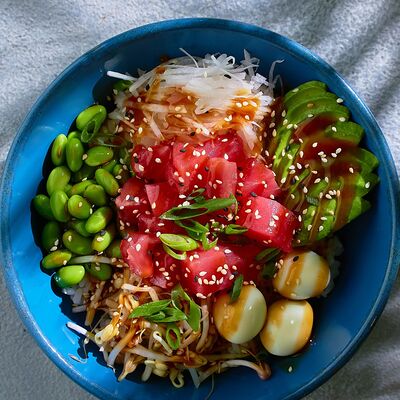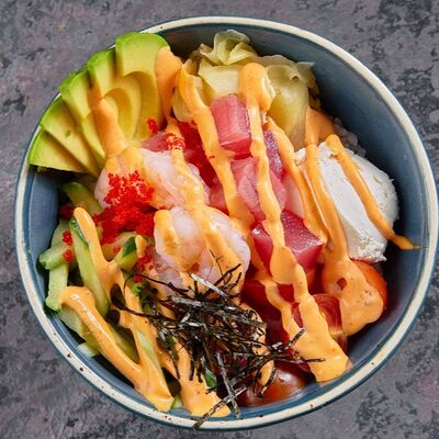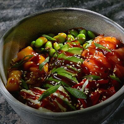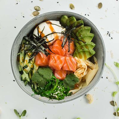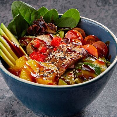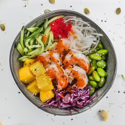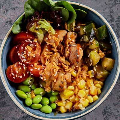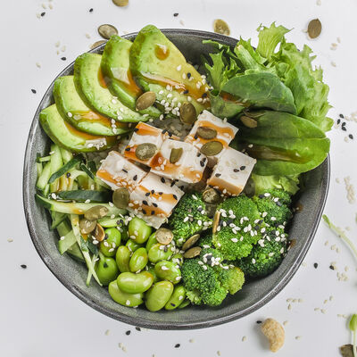 Рис, тофу, брокколи, микс-салат, огурец, авокадо, бобы эдамаме, тыквенные семечки, кунжут, соевый соус, терияки